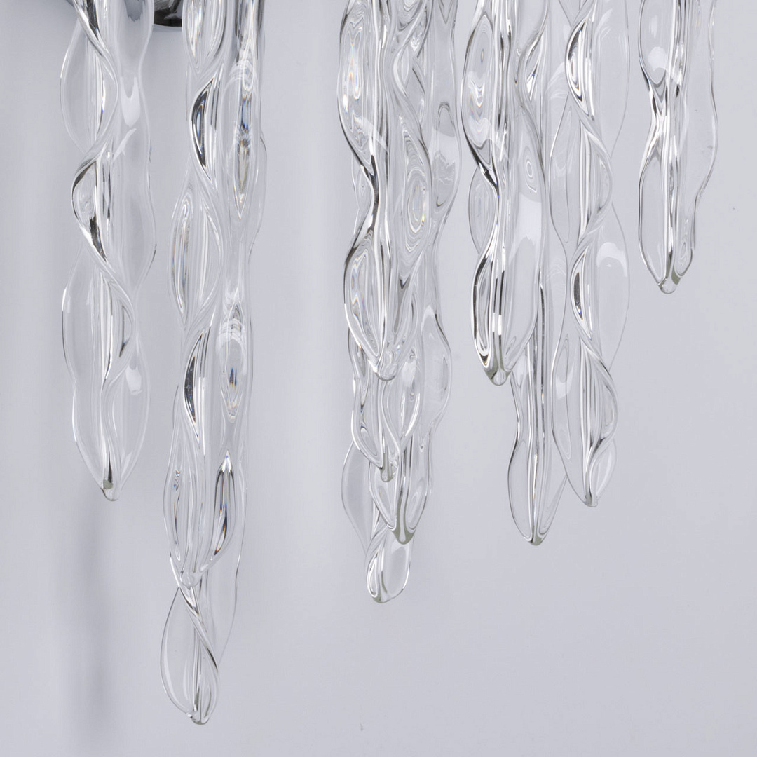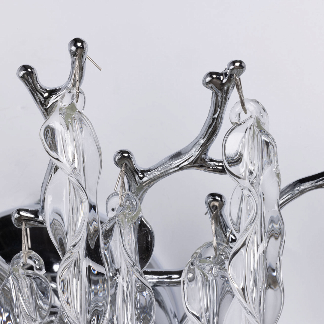 Современный дизайн с природными мотивами. Трендовая флористика, природа в доме. Декор в виде  подвесов оригинальной формы из прозрачного стекла придает светильнику индивидуальность и создает эффектную игру света. Заменяемые источники света удобны в эксплуатации.