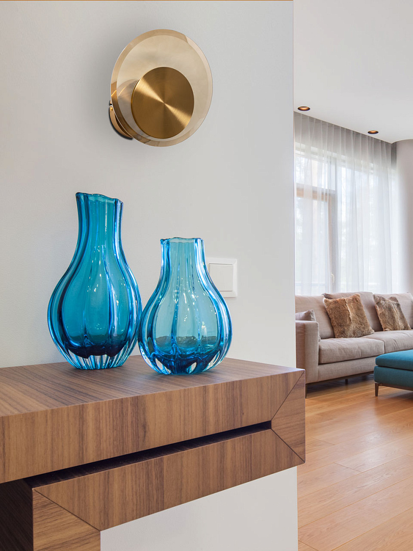 Актуальный цвет латуни смотрится современно. Оригинальный декор из стекла цвета шампань привлекает к себе внимание. Изысканности настенному бра придает декор из металлического круглого элемента. Заменяемый источник света удобен в эксплуатации.