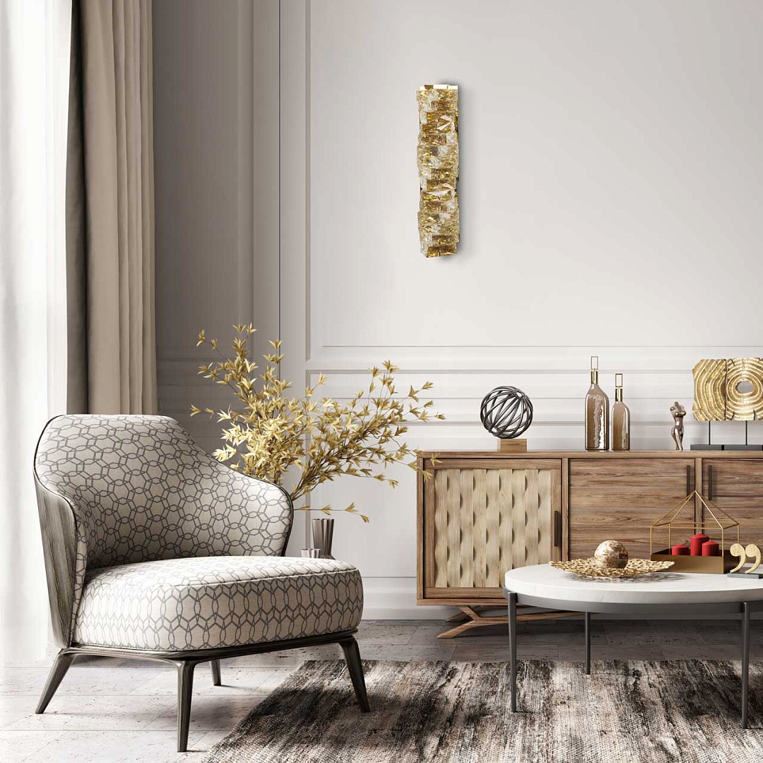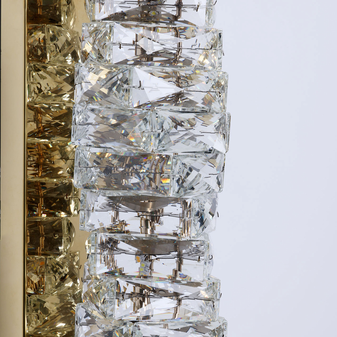 Благородный цвет золота сохраняет свою актуальность. Использование нержавеющей стали инновационно и современно. Оригинальный плафон из хрустальных элементов добавляет элегантности и стиля. Многорежимность с изменением цветовой температуры от 3000К до 6000К  является элементом светодизайна. Ступенчатое изменение интенсивности светового потока позволяет установить удобный режим освещения через настенный выключатель. Настенное бра сочетает в себе классические и современные элементы, эстетику, функциональность и энергоэффективность, создавая атмосферу уюта и роскоши. Светодиодные источники света экономичны и безопасны.