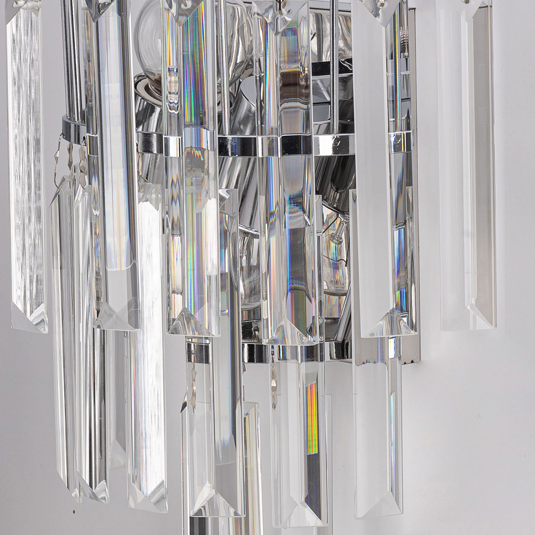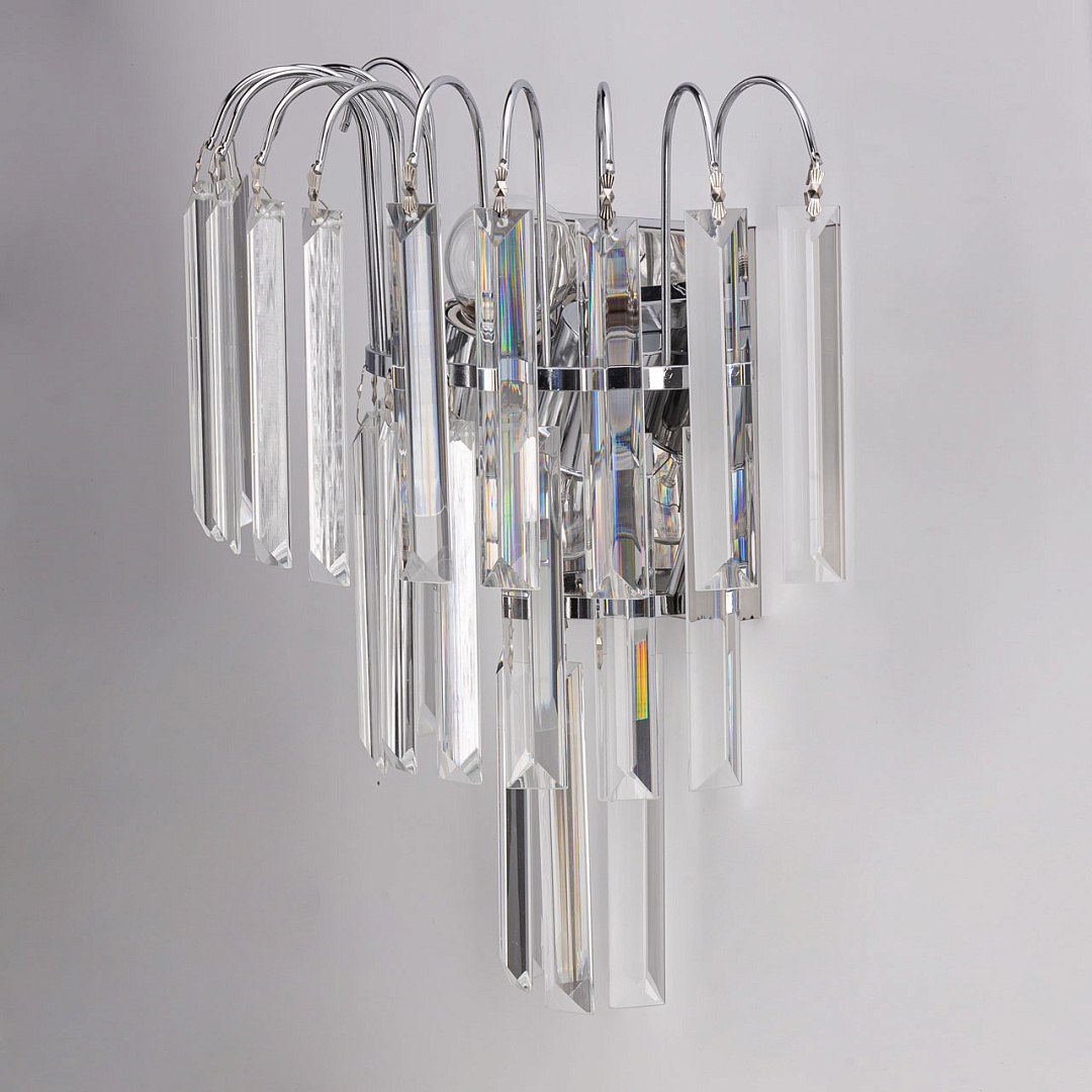 Настенная бра создает приятный местный светПрозрачный хрусталь вытянутой формы создает красивую игру света.Популярный  цвет хрома основания всегда в тренде.