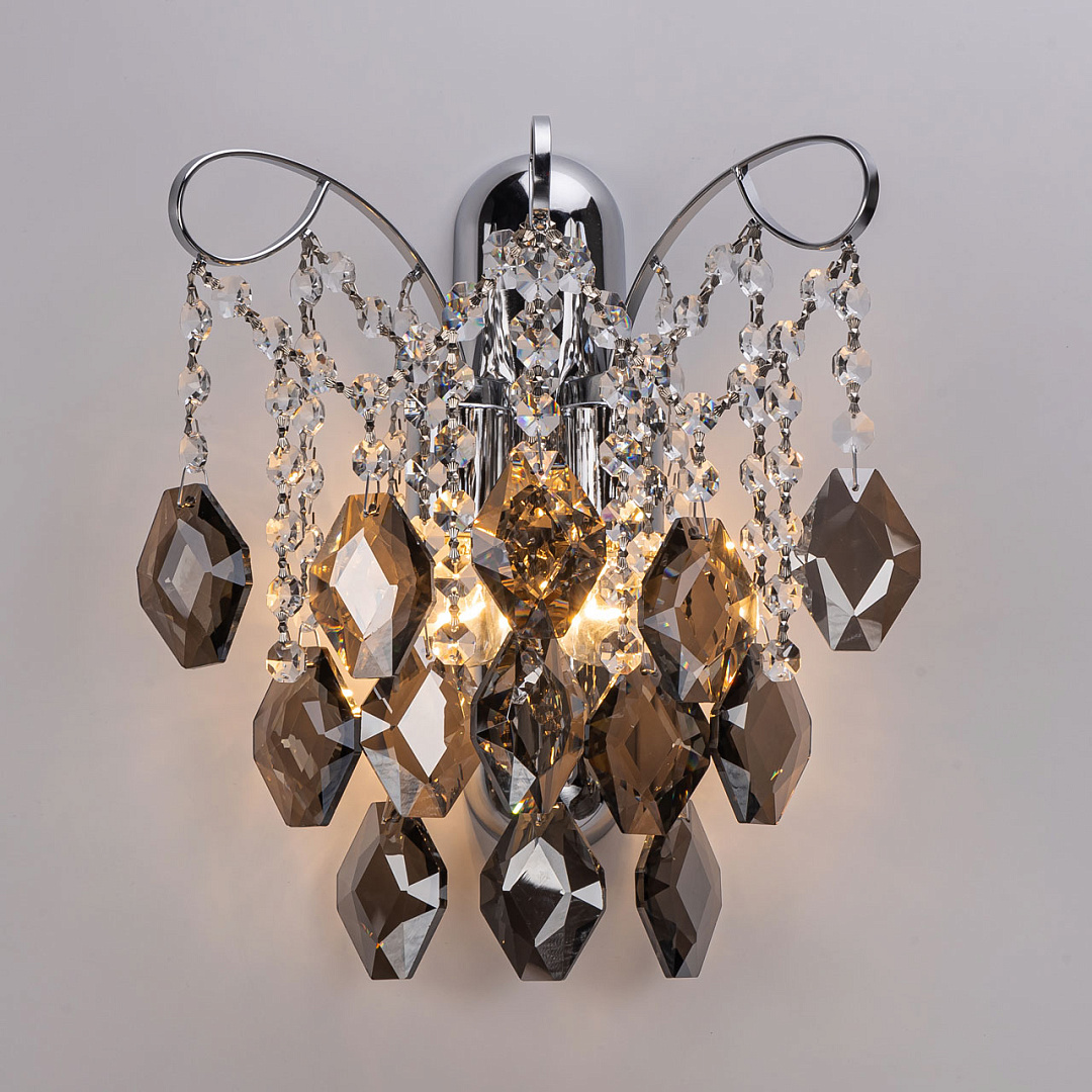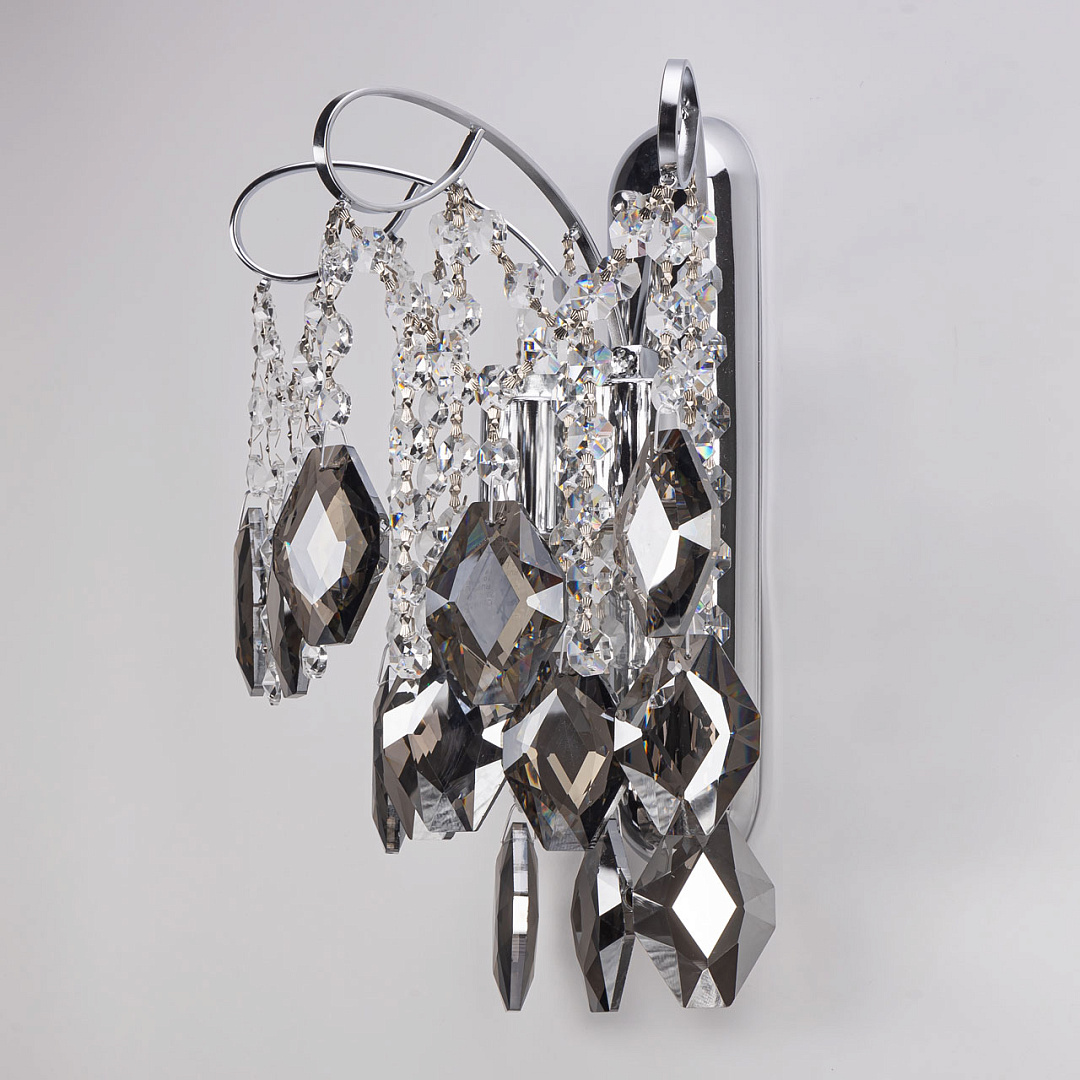 Хрустальный массивный декор дымчатого цвета оригинальной огранки и подвески из прозрачных октагонов создают красивую игру света.Популярный цвет хрома основания идеален для интерьеров в различных стилях.Заменяемые источники света удобны в эксплуатации.