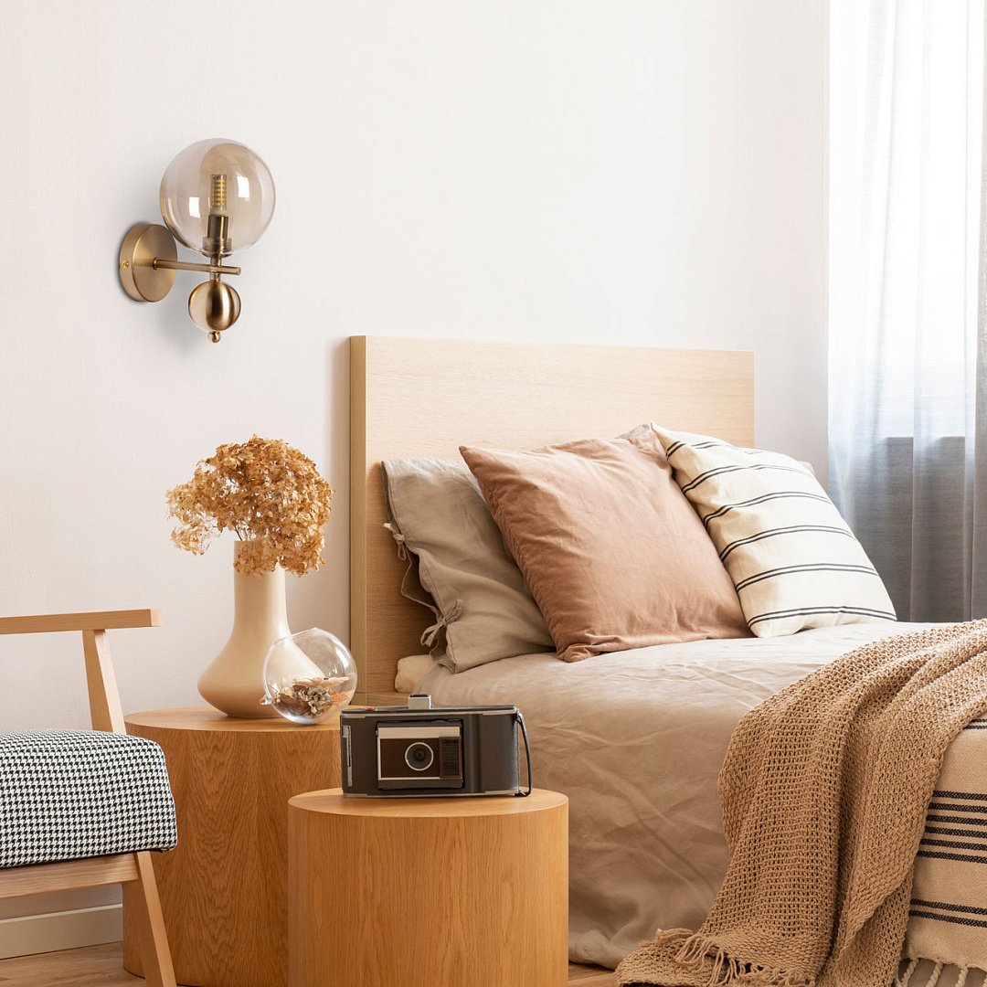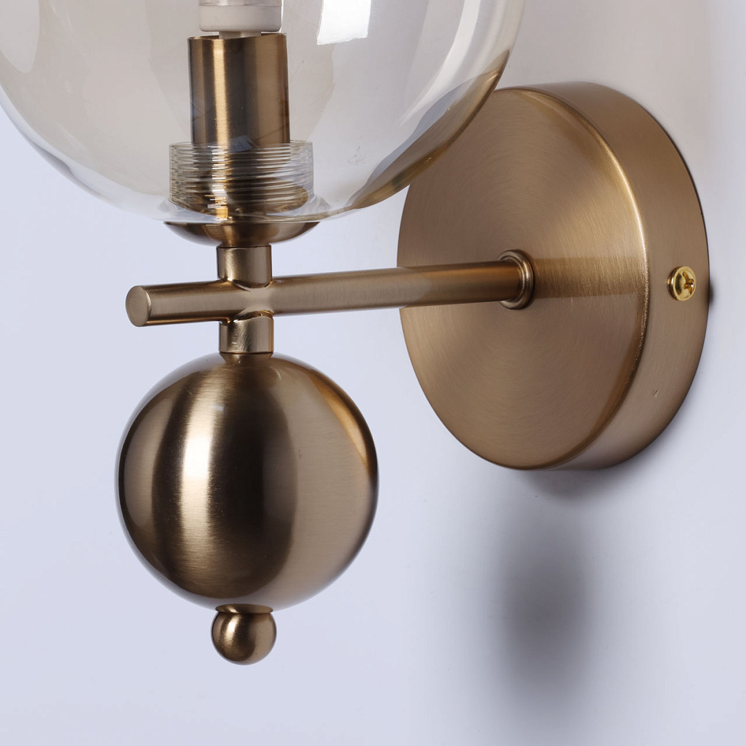 Светильник выполнен в модном минималистичном стиле. Актуальное сочетание основания цвета медовой бронзы и плафона цвета топаз  подойдет для большинства классических и современных интерьеров. Золотистый цвет стекла  плафона красиво преломляет свет. Заменяемый источник света удобен в эксплуатации.