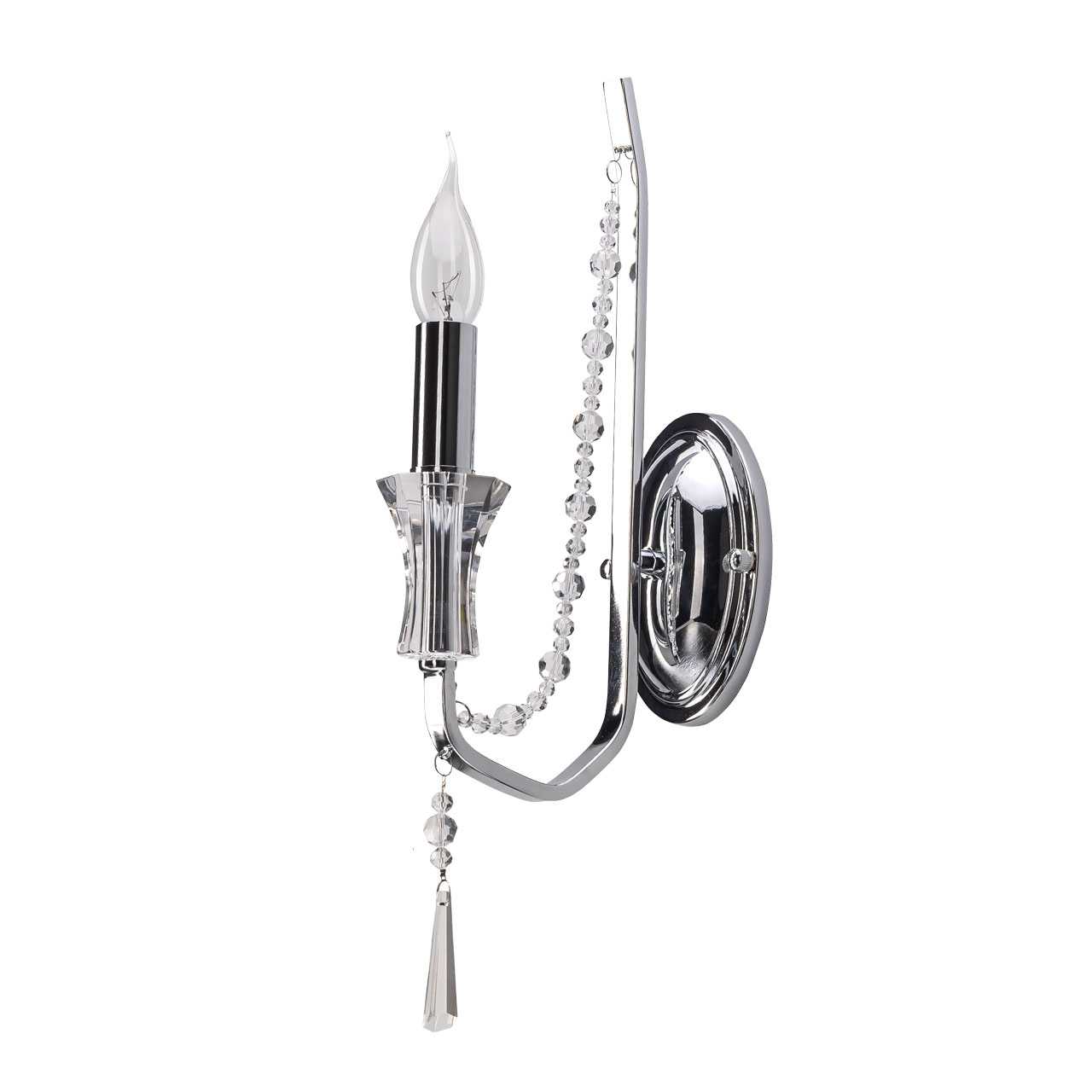 Трендовое сочетание хрусталя и цвета хрома выглядит актуально и современно.Хрустальный декор высокого качества придает настенному бра парадность и легкость.Заменяемые источники света удобны в эксплуатации.