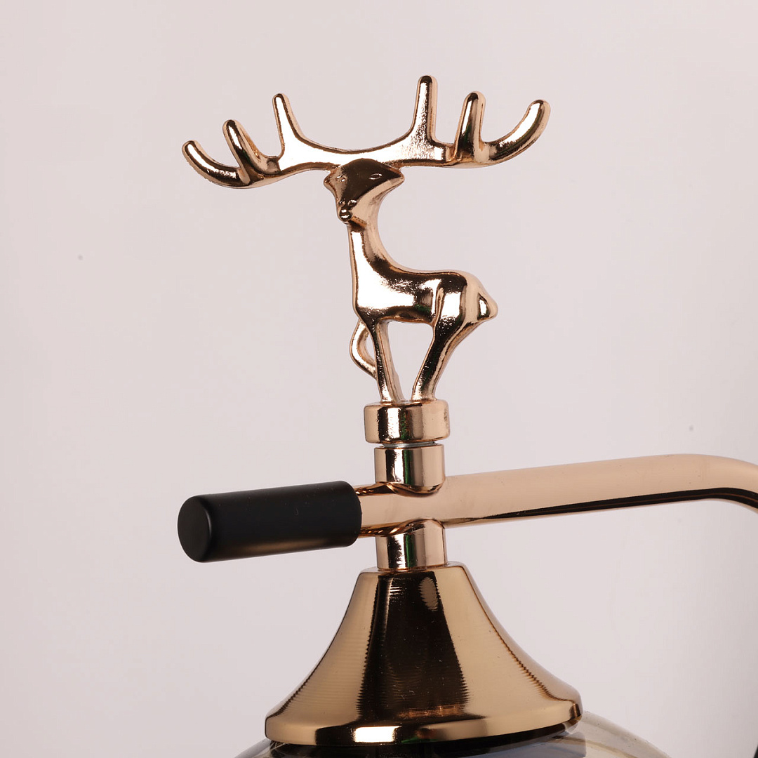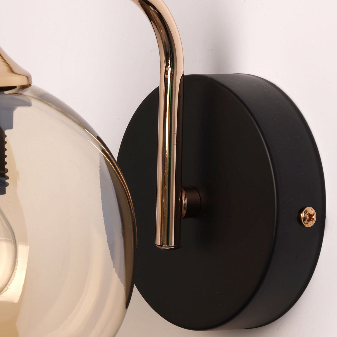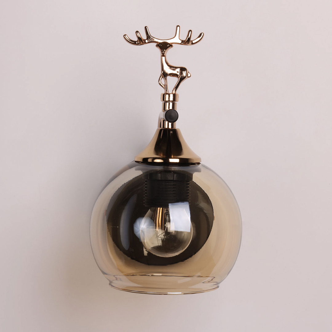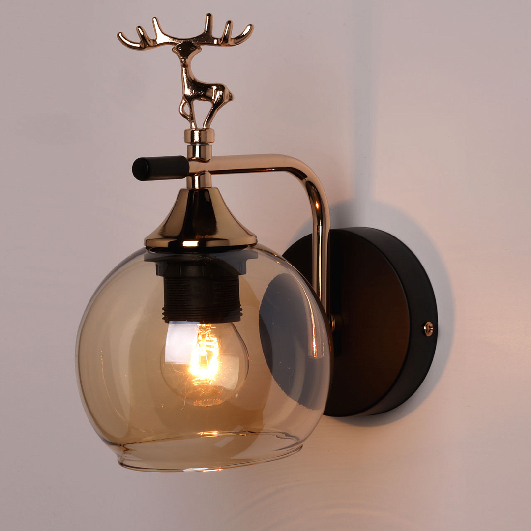 Контрастное сочетание черного цвета и цвета античной бронзы сохраняет свою актуальность. Стекло плафона цвета шампань создает уютное освещение. Оригинальный декор в виде фигурки оленя придает настенному бра изюминку и выделяет его в ряду декоративных светильников.  Заменяемый источник света удобен в эксплуатации.