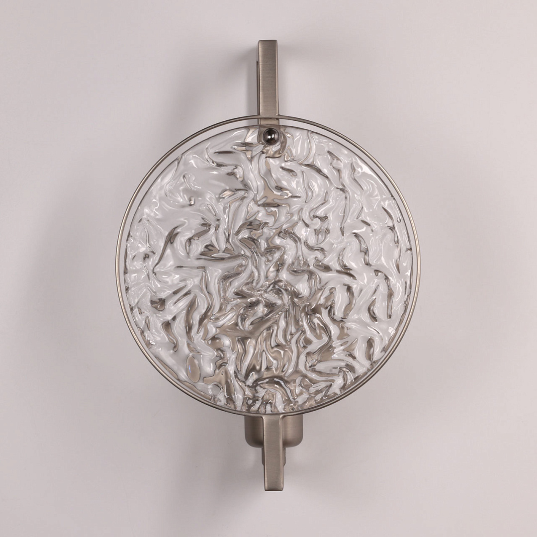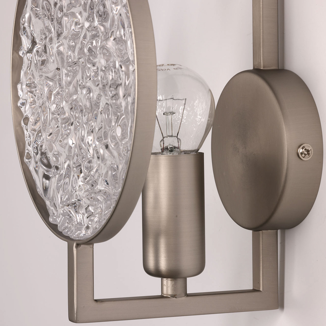 Настенное бра в цвете матового никеля выглядит стильно и современно. Оригинальный декоративный элемент из прозрачного фактурного стекла придает бра уникальности, делают ее прекрасным дополнением к интерьеру. Заменяемый источник света удобен в эксплуатации.