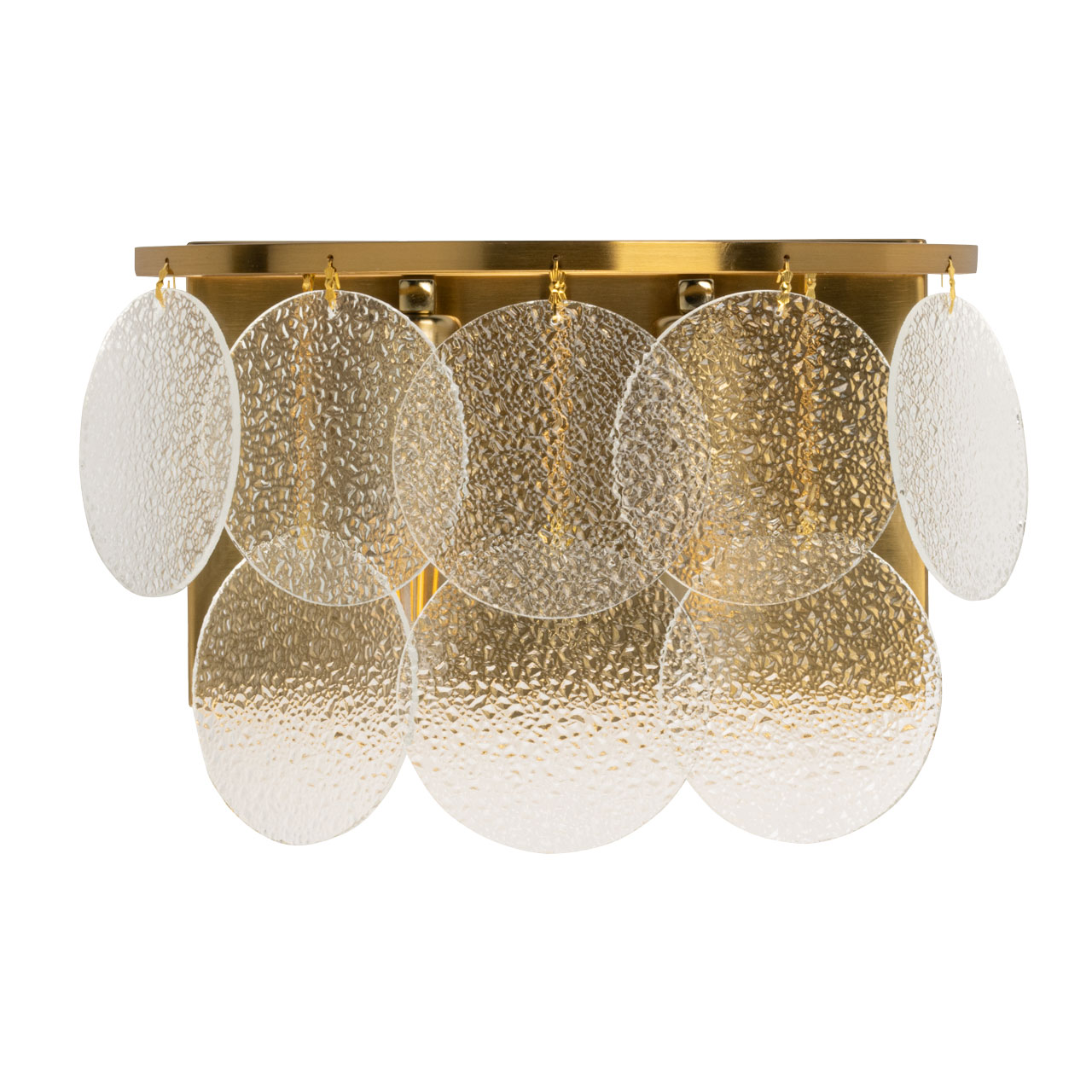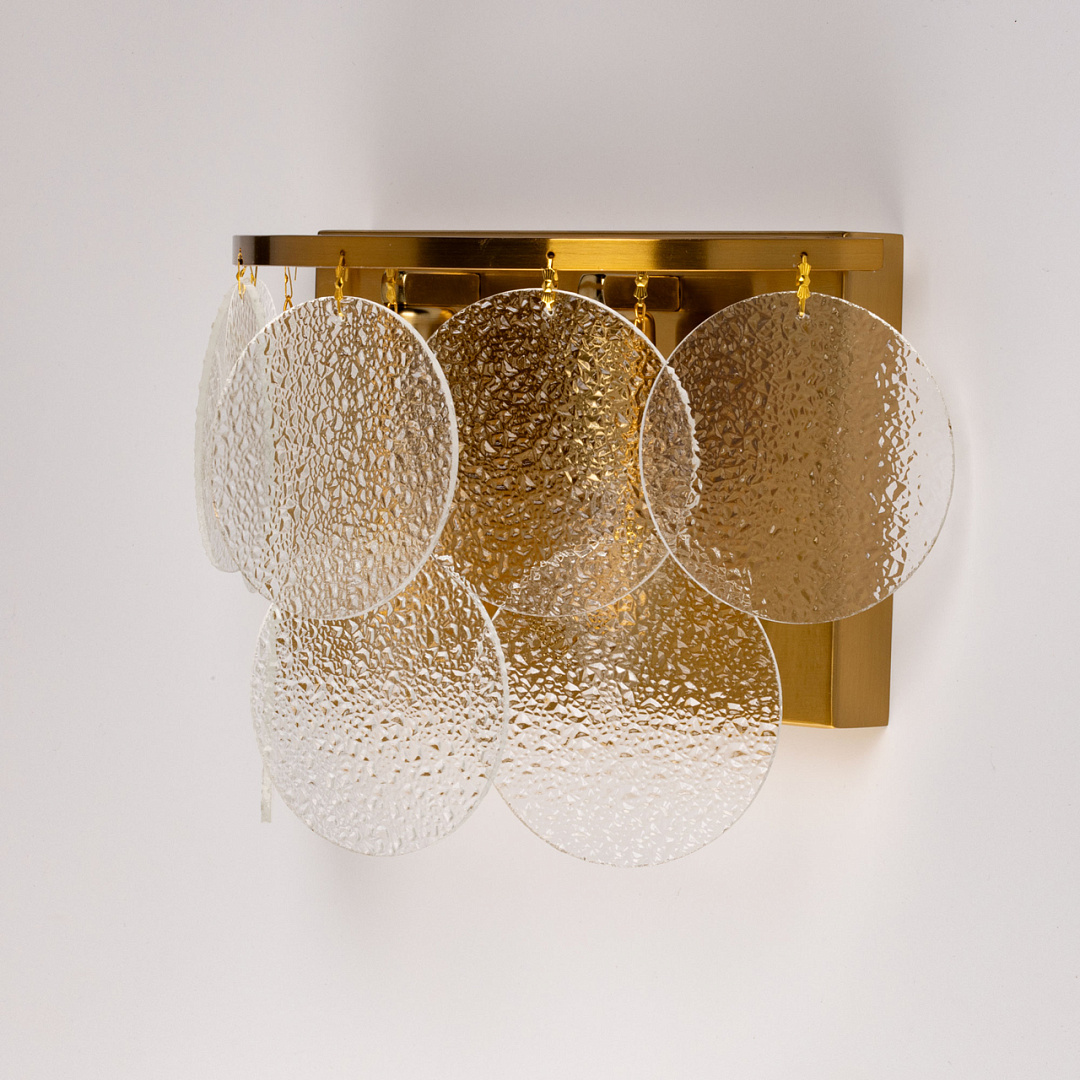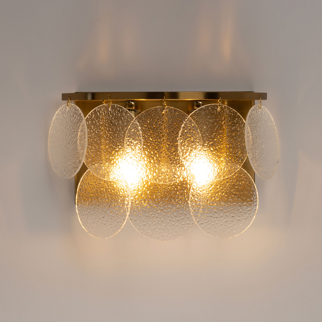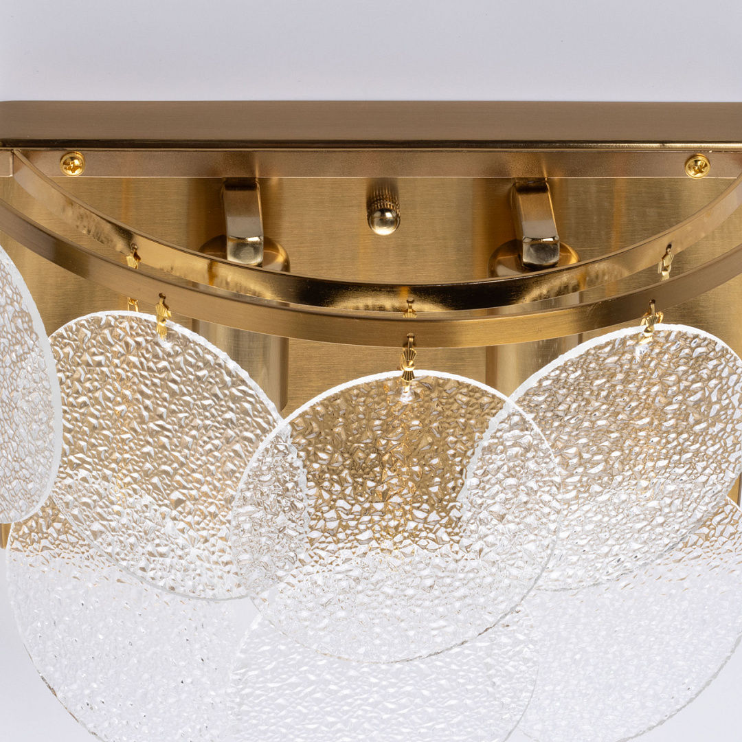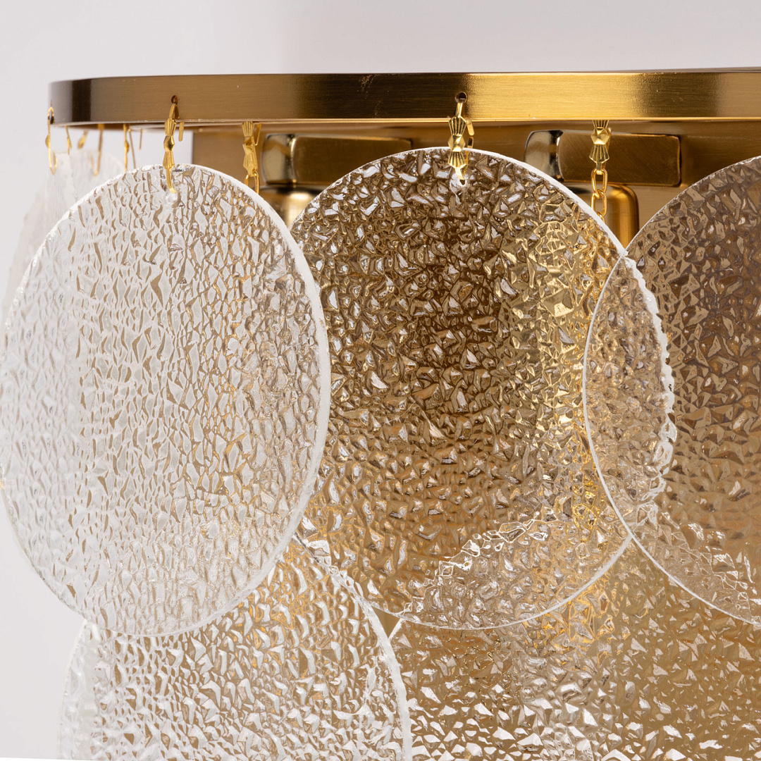 Актуальное сочетание классического цвета латуни и современного минималистичного дизайна. Оригинальный декор из фактурного стекла в тренде. Эффект вулканического стекла создает красивую игру света и тени. Заменяемые источники света удобны в эксплуатации.