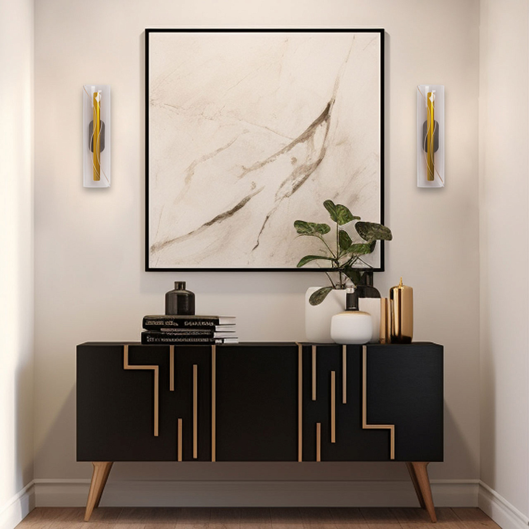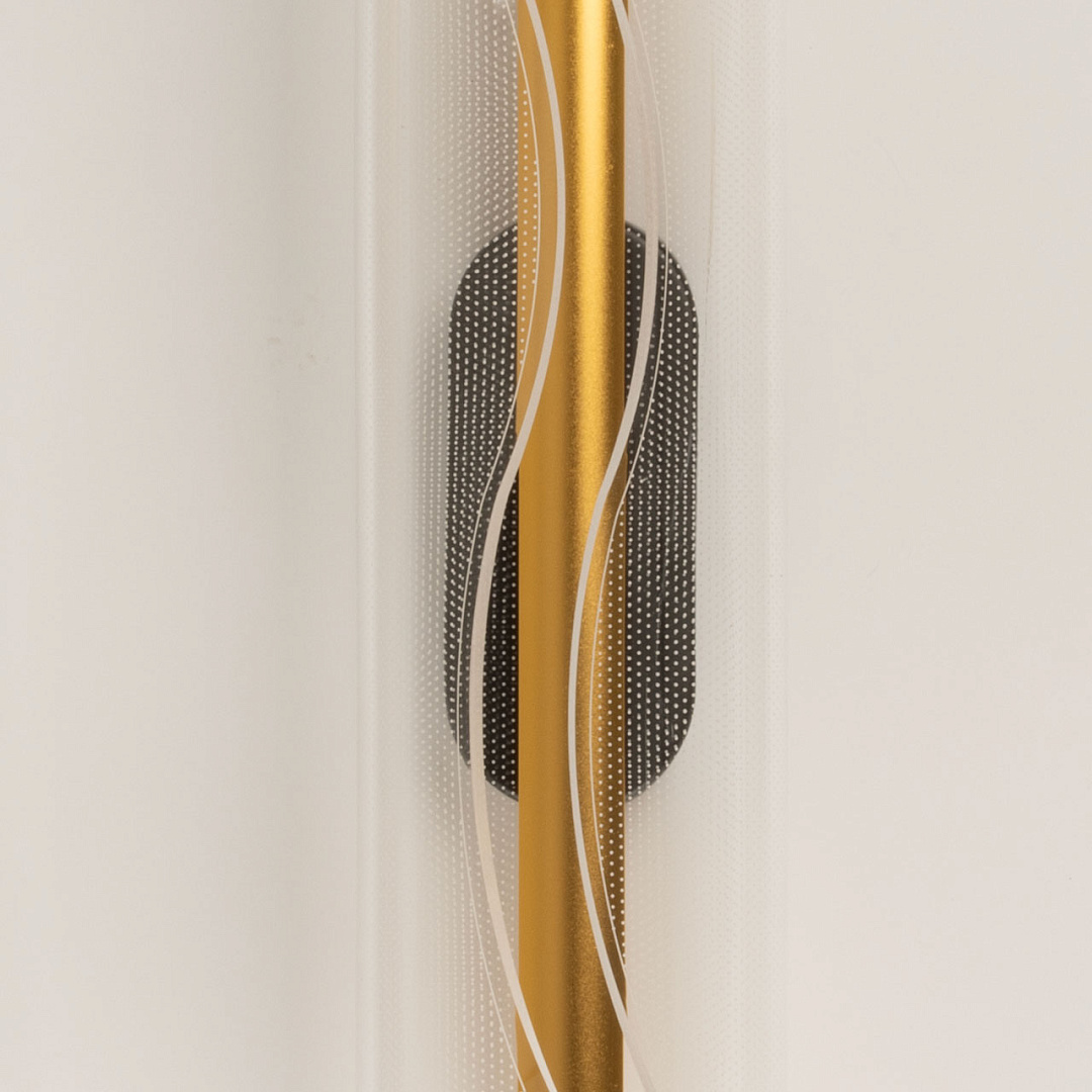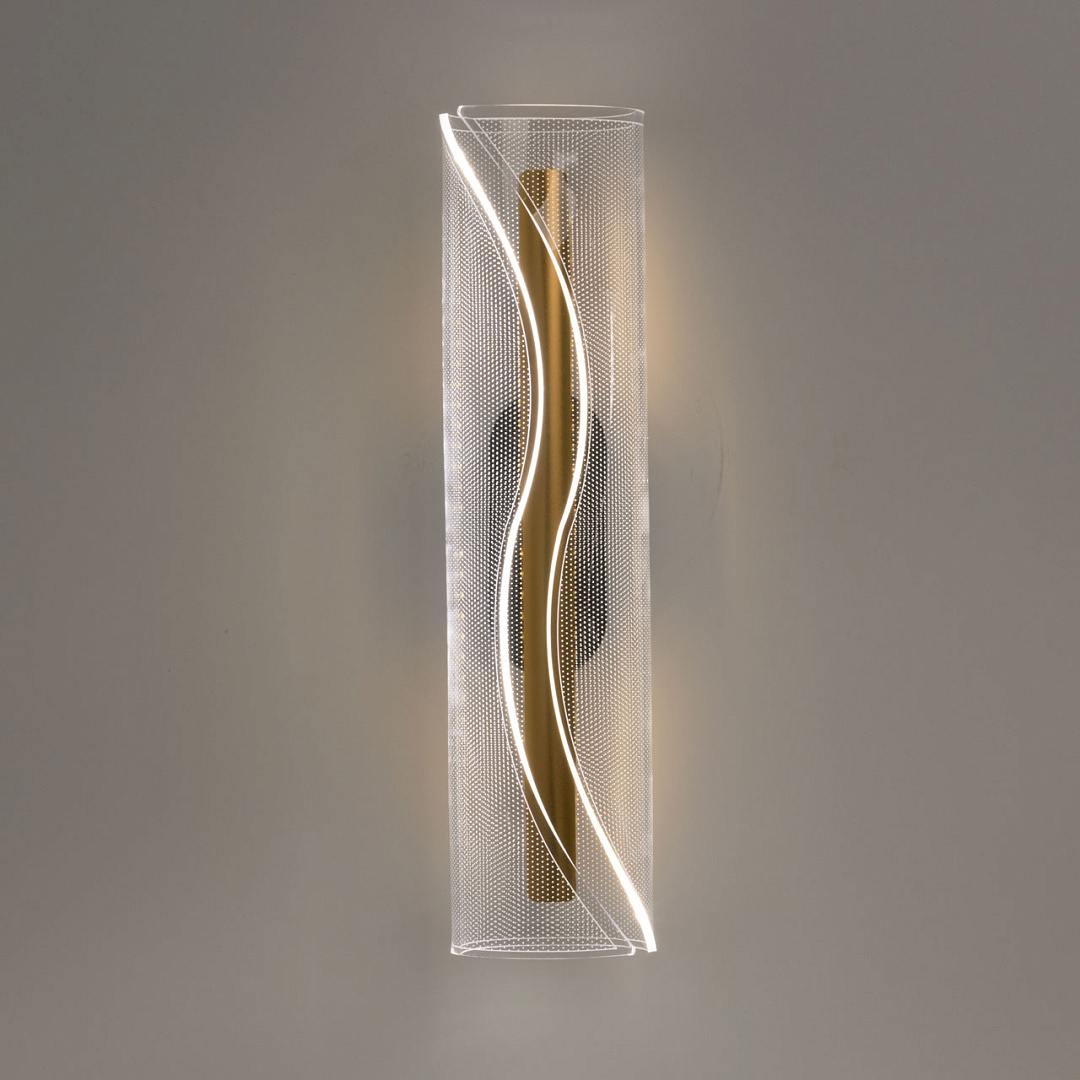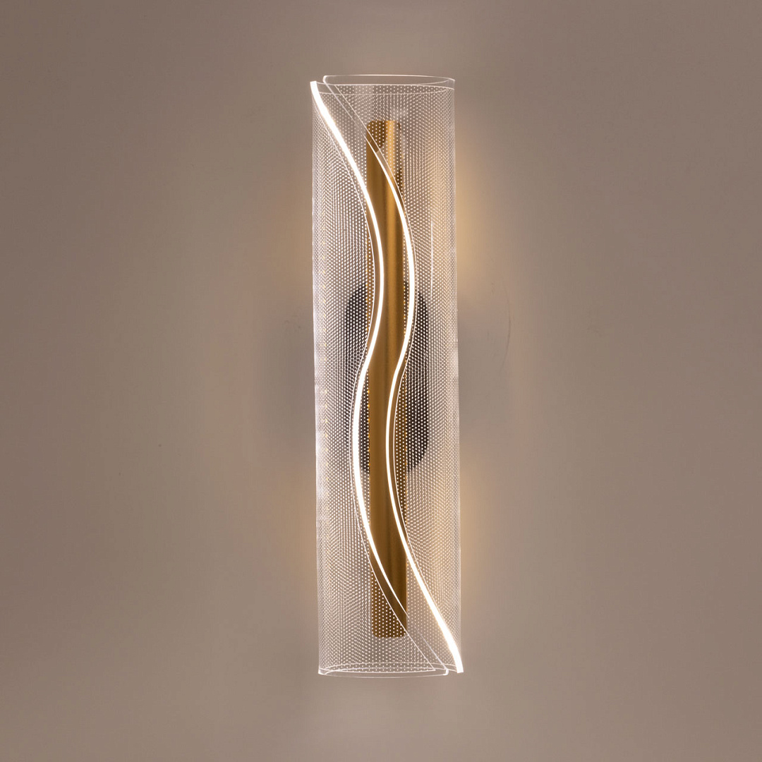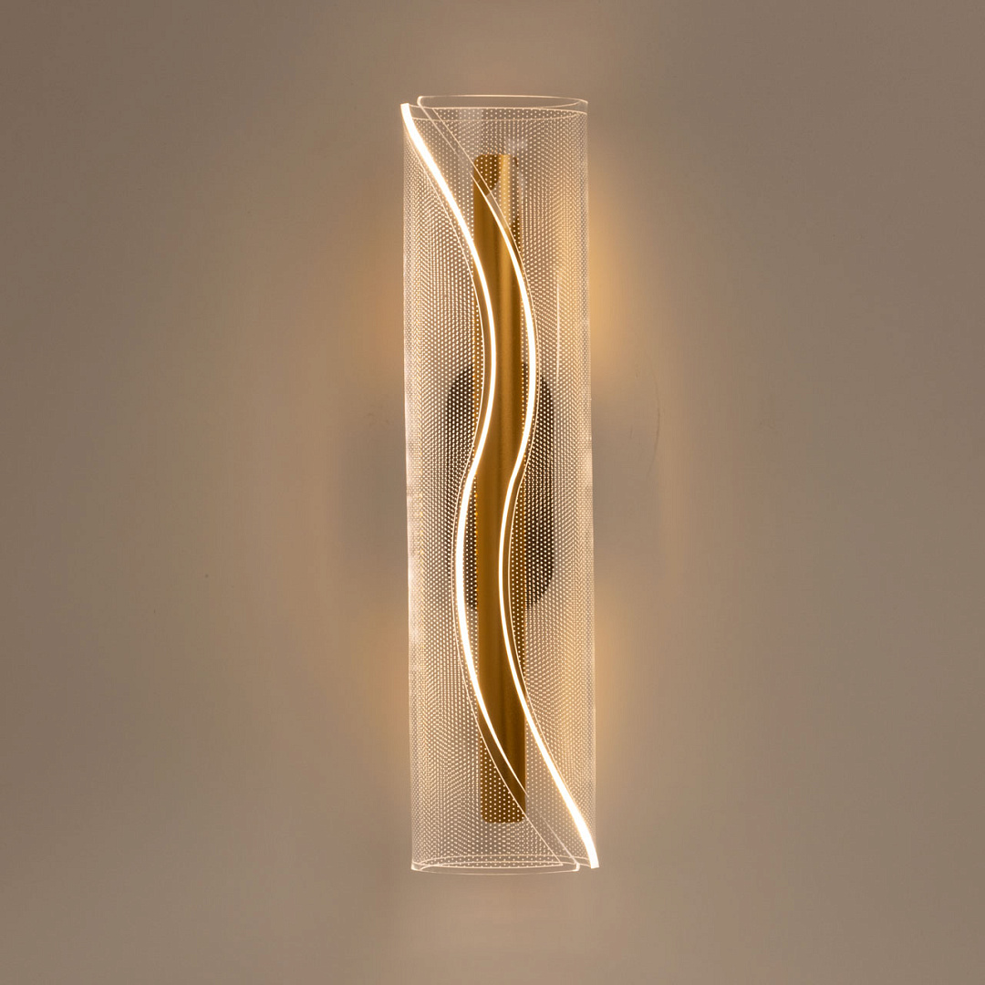 Для придания дополнительного шарма в настенном бра гармонично сочетается глубокий черный цвет и цвет золота. Эффектный плафон из прозрачного акрила с рисунком красиво преломляет свет. Многорежимность с изменением цветовой температуры от 3000К до 6500К является элементом светодизайна и позволяет подобрать комфортную температуру света через настенный выключатель. Качественные светодиоды и корпус из сплава алюминия обеспечивают яркое освещение и долгий срок службы.