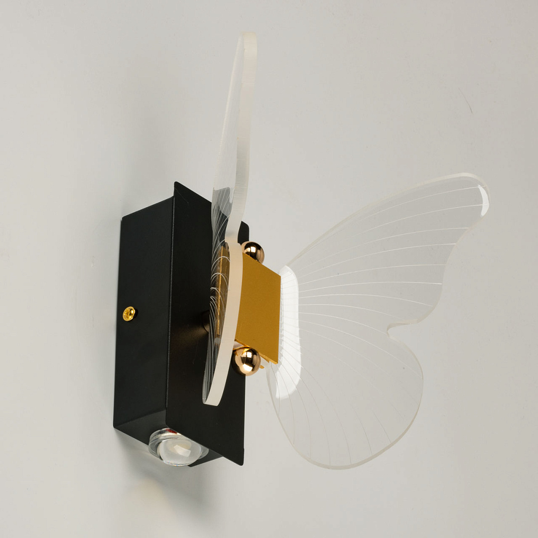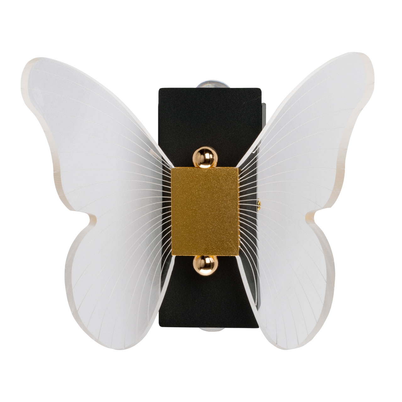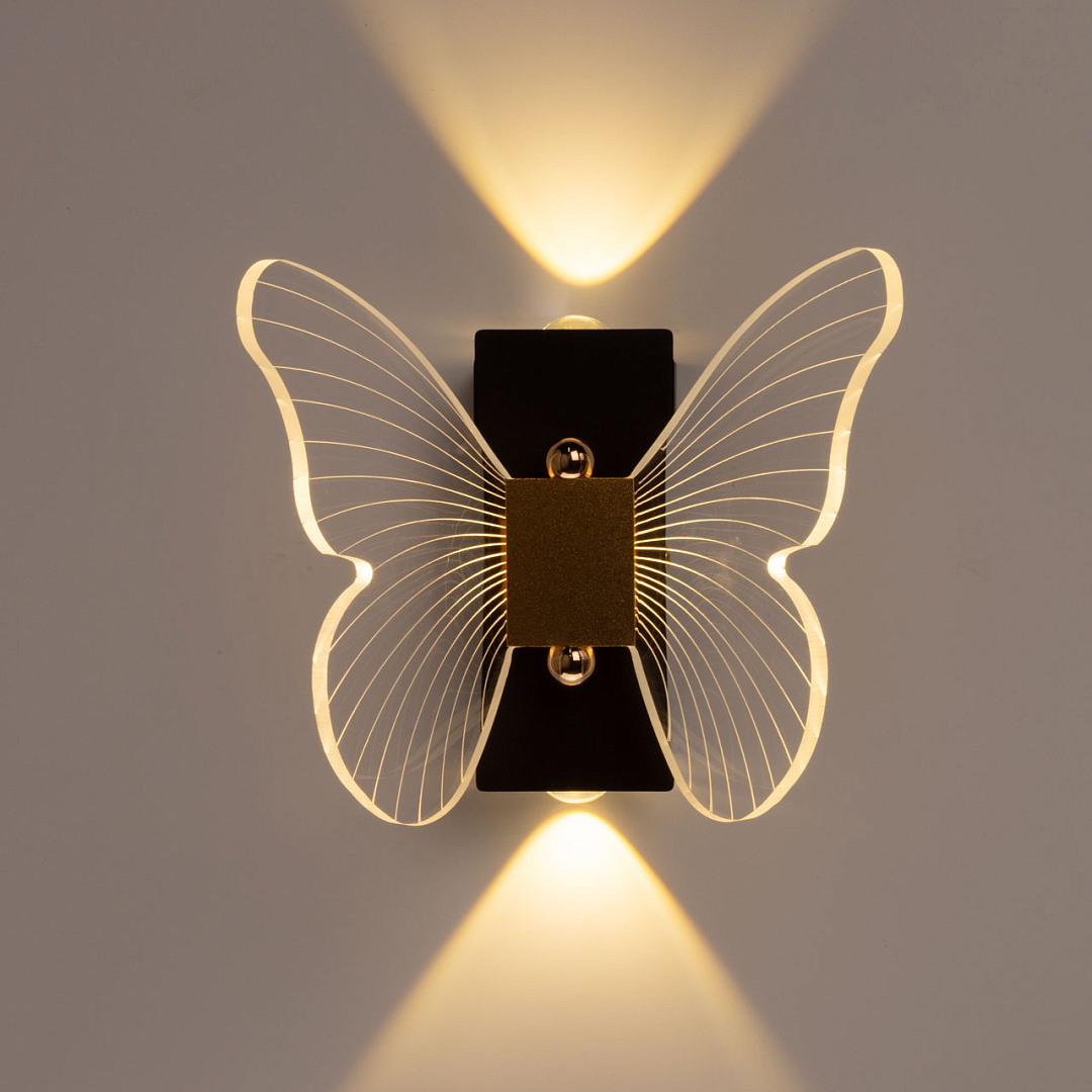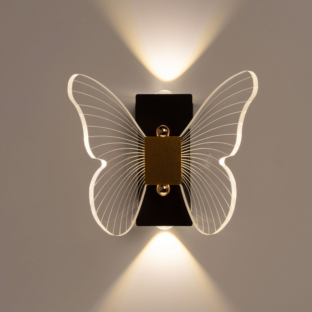 Для придания дополнительного шарма в настенном бра гармонично сочетаются глубокий черный цвет и цвет золота. Эффектный плафон из прозрачного акрила в форме бабочки придает дизайну бра индивидуальность. Многорежимность с изменением цветовой температуры от 3000К до 6500К является элементом светодизайна и позволяет подобрать комфортную температуру света через настенный выключатель. Качественные светодиоды и корпус из сплава алюминия обеспечивают яркое освещение и долгий срок службы. Светодиодные источники света экономичны и безопасны.