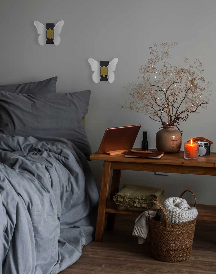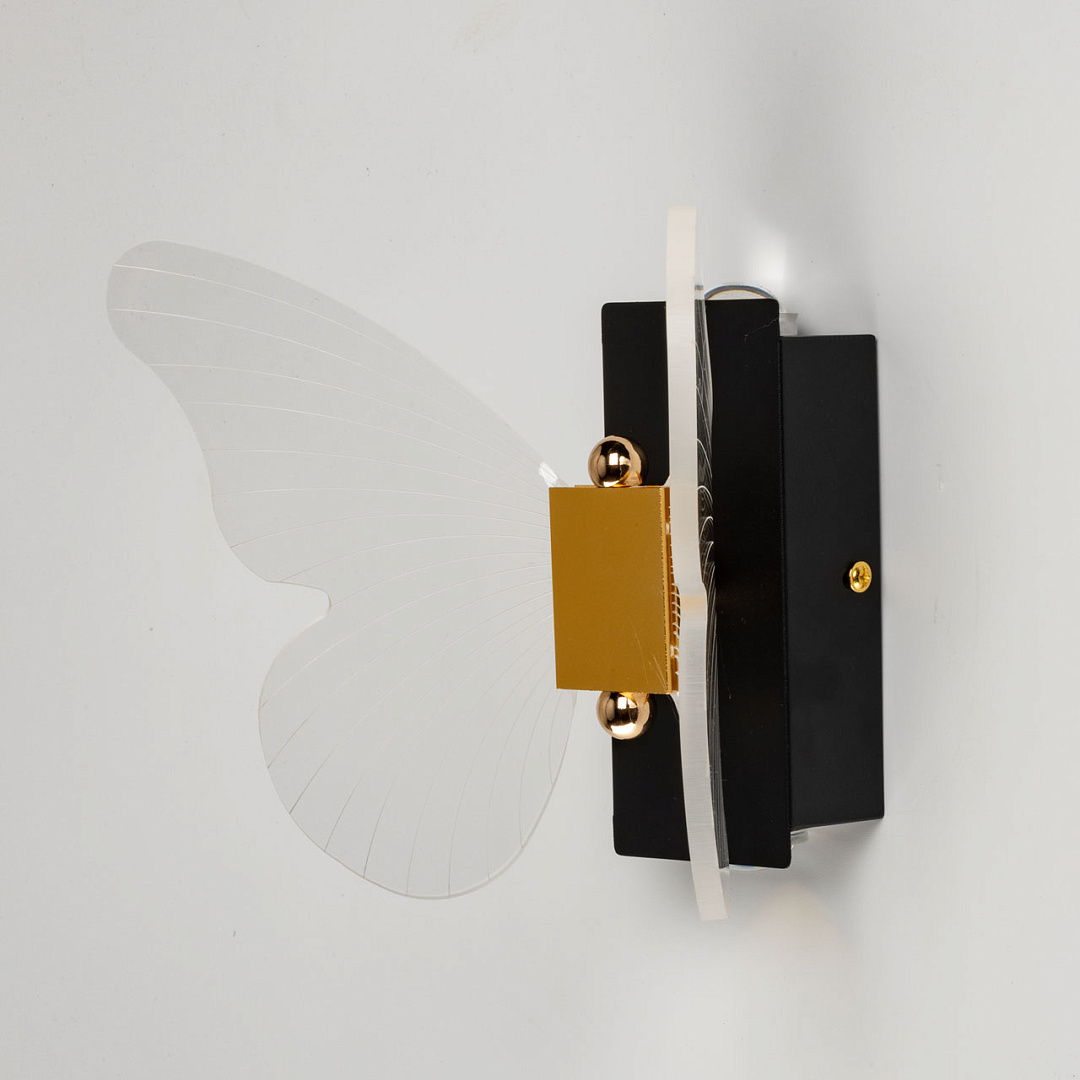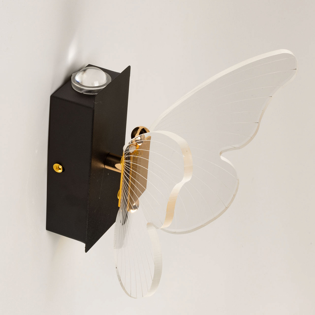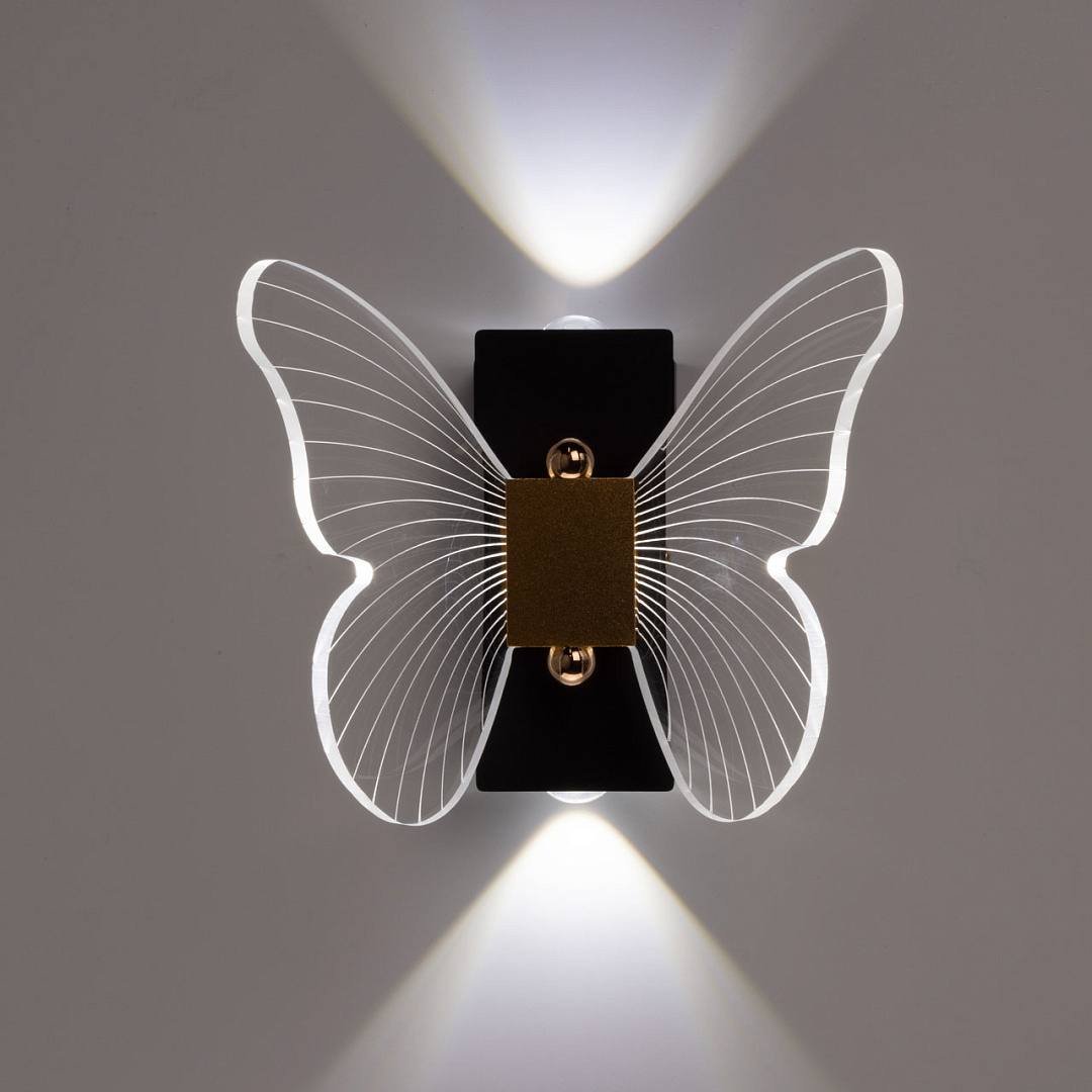 Для придания дополнительного шарма в настенном бра гармонично сочетаются глубокий черный цвет и цвет золота. Эффектный плафон из прозрачного акрила в форме бабочки придает дизайну бра индивидуальность. Многорежимность с изменением цветовой температуры от 3000К до 6500К является элементом светодизайна и позволяет подобрать комфортную температуру света через настенный выключатель. Качественные светодиоды и корпус из сплава алюминия обеспечивают яркое освещение и долгий срок службы. Светодиодные источники света экономичны и безопасны.
