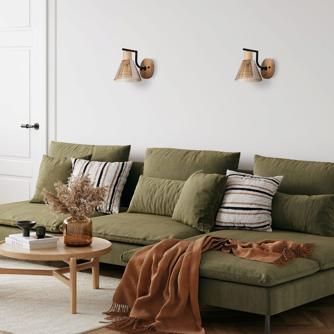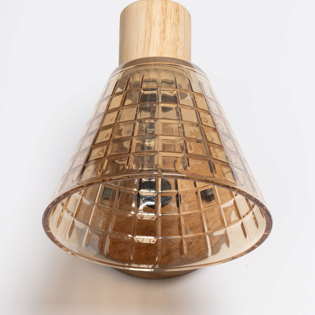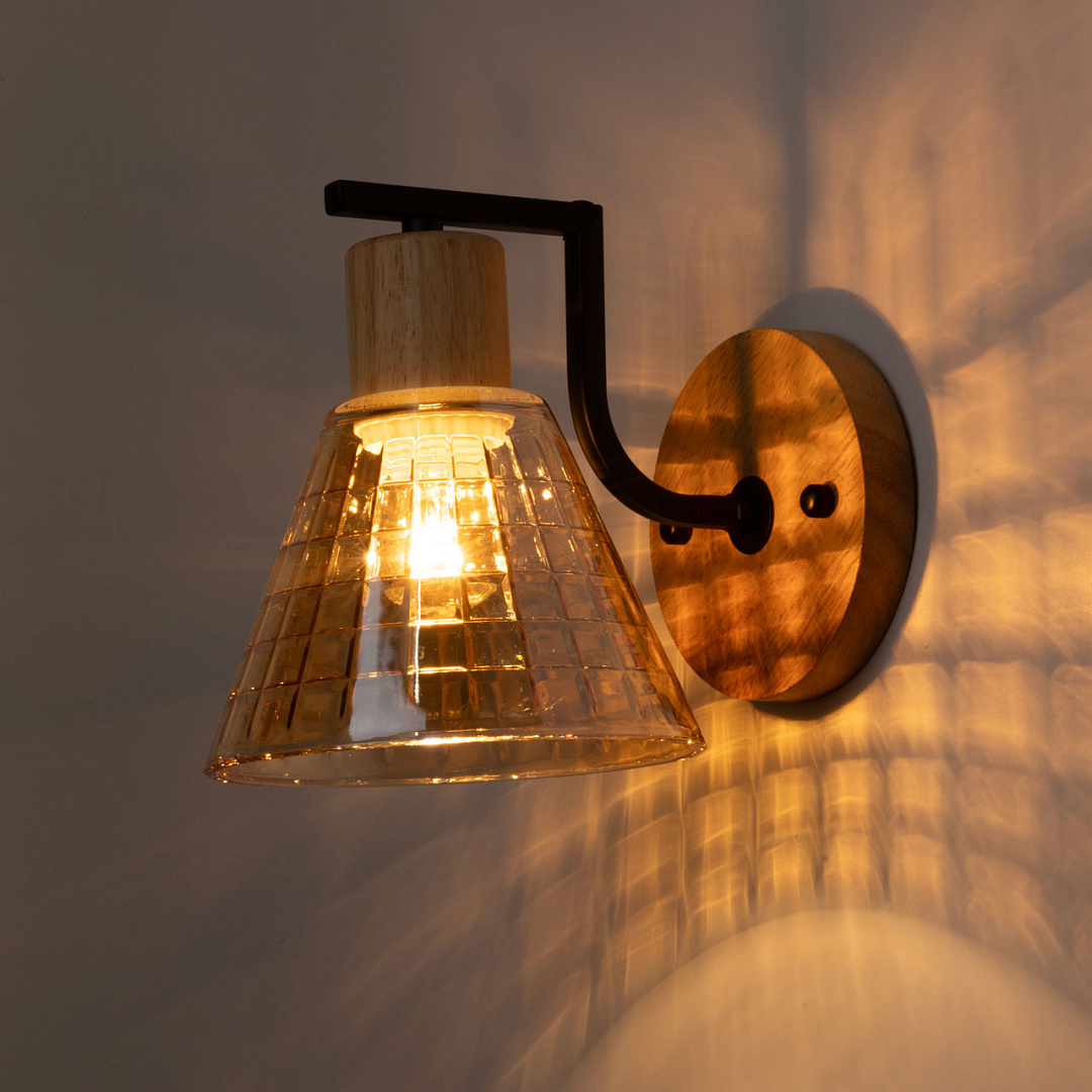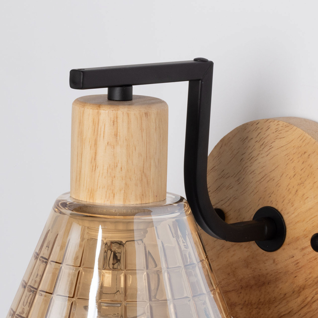 Глубокий черный цвет придает настенному бра сдержанную элегантность. Благородный оттенок стеклянного плафона красиво рассеивает свет. Декор из натурального дерева создает гармоничное сочетание материалов и фактур.  Благодаря интересному дизайну этот светильник станет прекрасным дополнением к любому интерьеру. Заменяемый источник света удобен в эксплуатации.