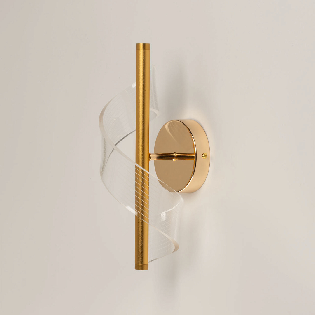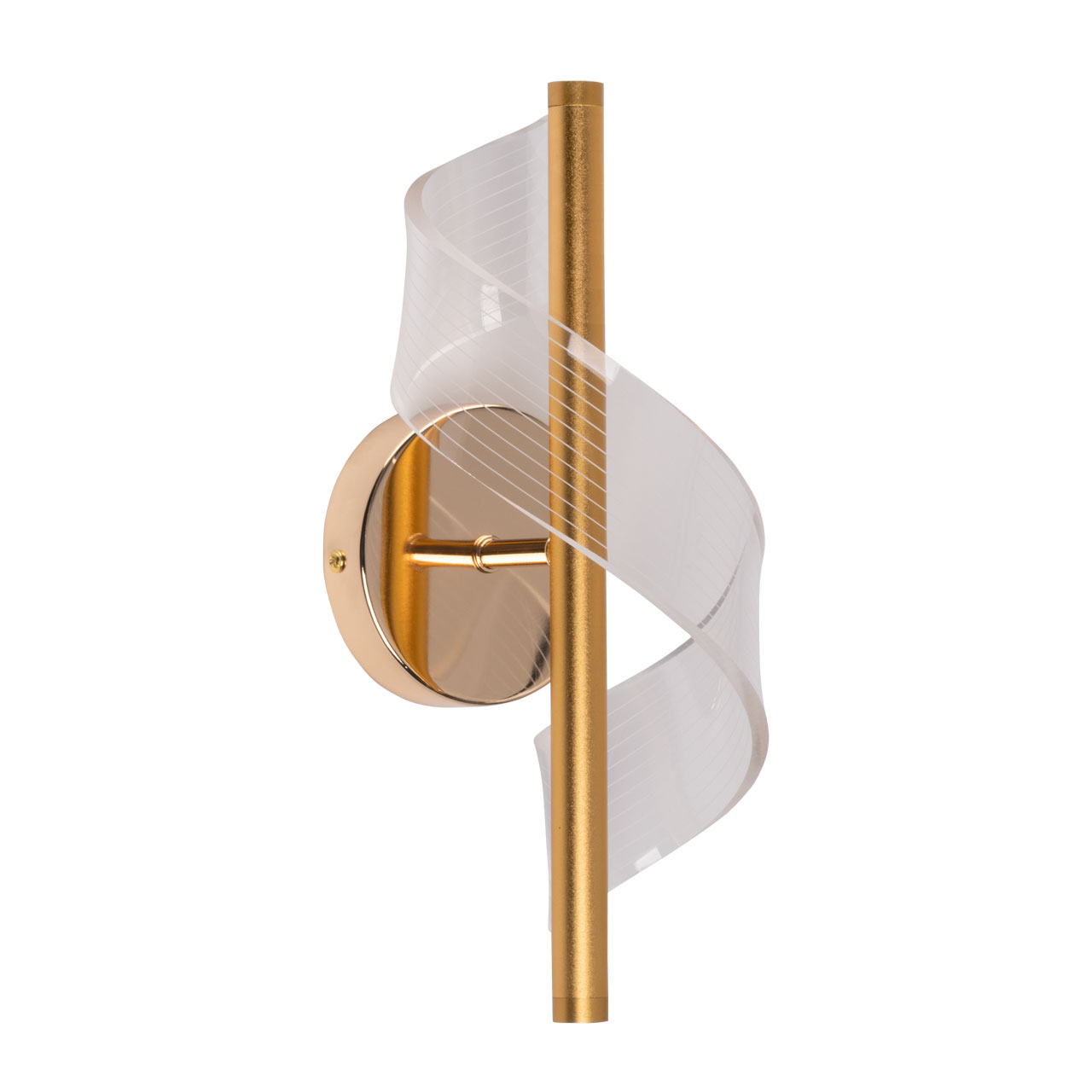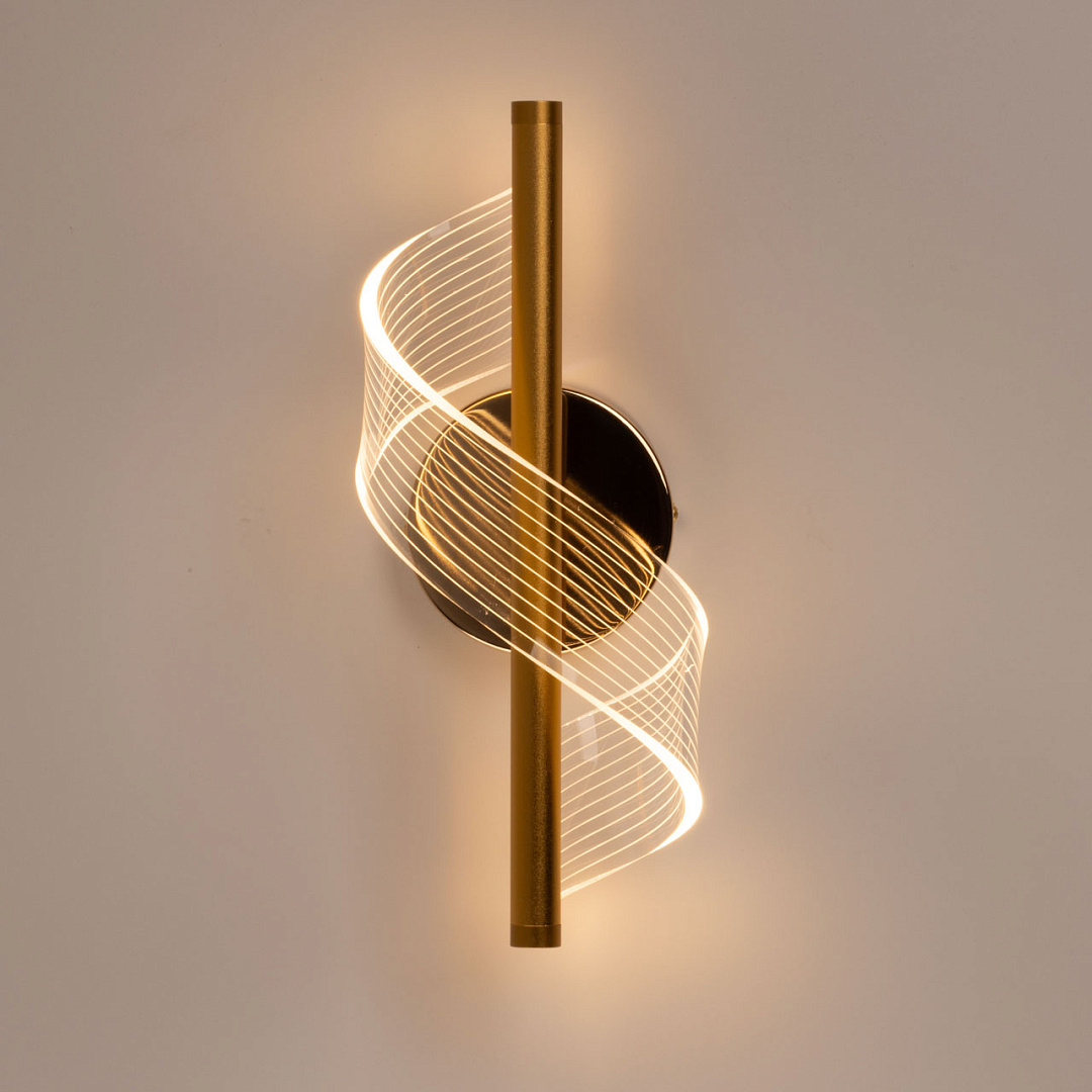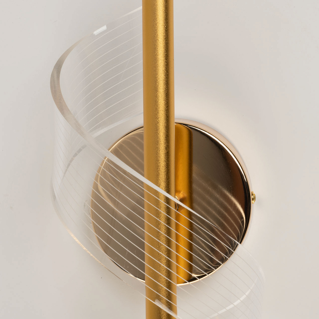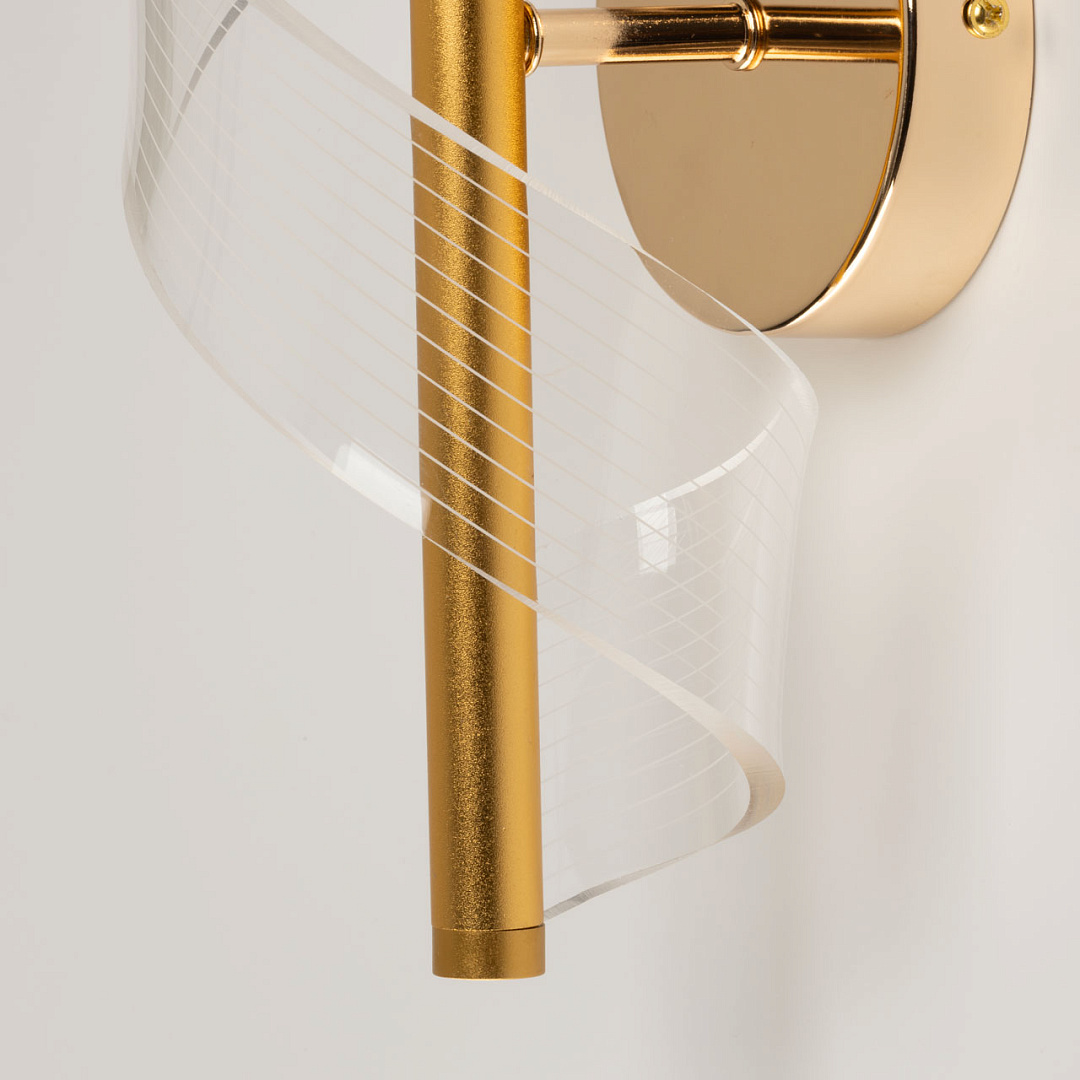 Современное настенное бра подходит в интерьеры в стиле хай-тек. Золотой цвет основания придает настенному бра изящества. Оригинальный плафон из прозрачного акрила в виде закрученной ленты делает бра арт объектом. Многорежимность освещения от 3000К до 6500К позволяет подобрать комфортную температуру света через настенный выключатель. Качественные светодиоды экономичны и безопасны. Эффектный декор из прозрачного акрила с линейным рисунком придает бра индивидуальности.