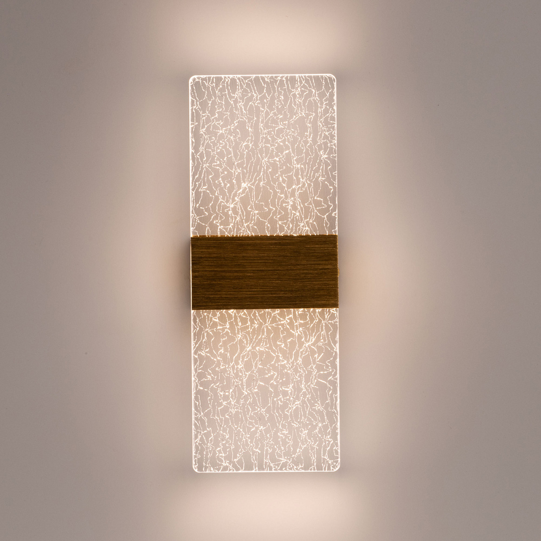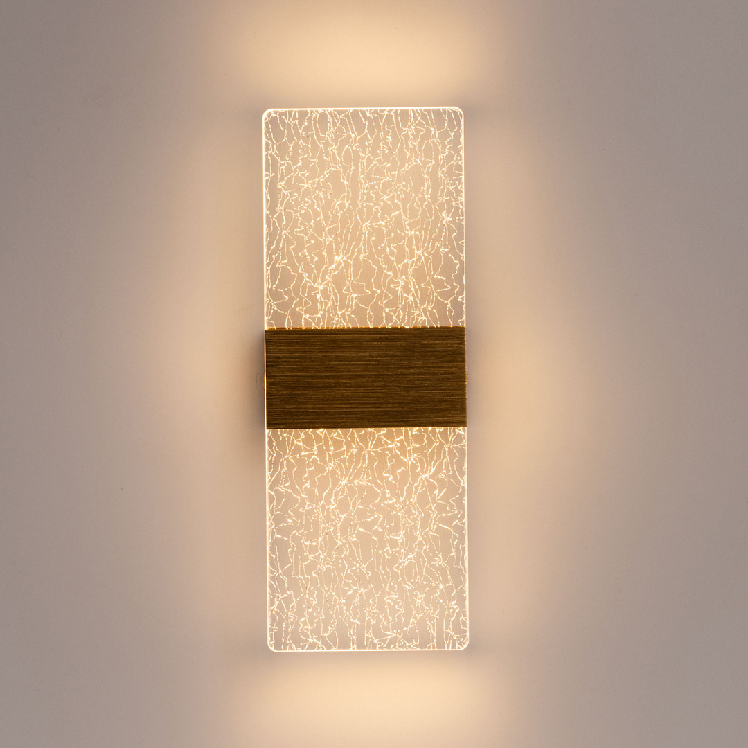 Золотой цвет основания благородно смотрится в интерьере, а технологичные штрихи на корпусе плафона создают дополнительный декоративный эффект. Полупрозрачный акрил с оригинальным декором мягко рассеивает свет, внося в интерьер комфорт и уют. Многорежимность с изменением цветовой температуры от 3000К до 6500Кявляется элементом светодизайна и позволяет подобрать комфортную температуру света через настенный выключатель. Качественные светодиоды и корпус из сплава алюминия обеспечивают яркое освещение и долгий срок службы. Таким образом, настенное бра сочетает в себе элегантность и функциональность. Светодиодные источники света экономичны и безопасны.