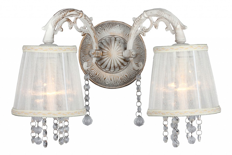 металла белого и золотого цветов. Поверхность арматуры матовая. Плафон изготовлен из текстиля белого цвета, имеет конусную форму и матовую поверхность. Направлен вниз. Осветительный прибор рассчитан на освещение пространства площадью 4 кв. м. Тип цоколя используемых ламп E14. Производитель рекомендует использовать лампы мощностью не более 40 Вт. Суммарная мощность светильника составляет 80 Вт. Лампочки в комплект не входят. Защита от попадания влаги и пыли внутрь изделия не предусмотрена. Рекомендуем к применению в гостиной, кабинете, спальне.