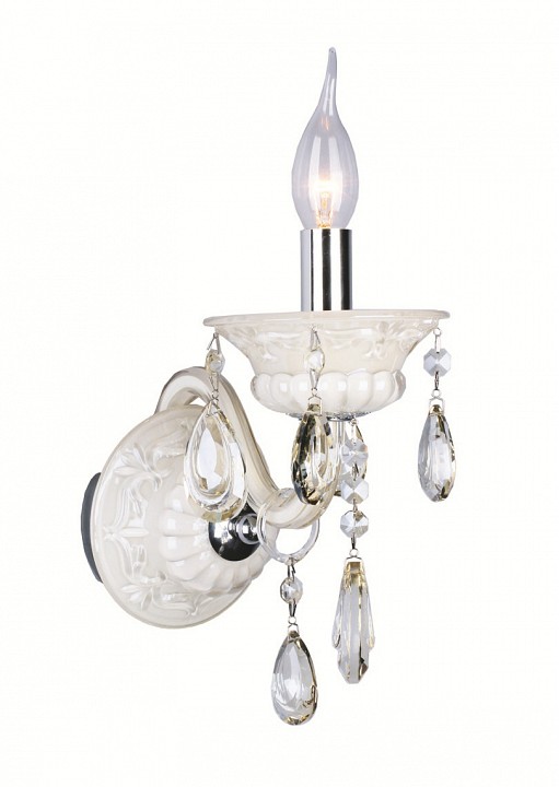 металла кремового цвета. Поверхность арматуры глянцевая. Плафон отсутствует. Осветительный прибор рассчитан на освещение пространства площадью 2 кв. м. Тип цоколя используемых ламп E14. Производитель рекомендует использовать лампы мощностью не более 40 Вт. Суммарная мощность светильника составляет 40 Вт. Лампочки в комплект не входят. Защита от попадания влаги и пыли внутрь изделия не предусмотрена. Рекомендуем к применению в гостиной, кабинете, спальне.