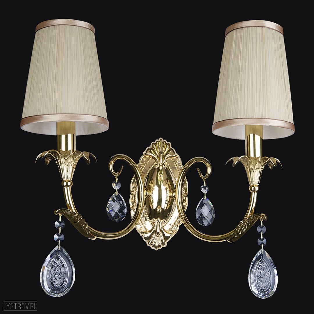 металла золотого цвета. Поверхность арматуры глянцевая. Плафон изготовлен из текстиля белого цвета, имеет конусную форму и матовую поверхность. Направлен вверх и вниз. Декоративные элементы выполнены из прозрачного хрусталя. Осветительный прибор рассчитан на освещение пространства площадью 4 кв. м. Тип цоколя используемых ламп E14. Производитель рекомендует использовать лампы мощностью не более 40 Вт. Суммарная мощность светильника составляет 80 Вт. Лампочки в комплект не входят. Защита от попадания влаги и пыли внутрь изделия не предусмотрена. Рекомендуем к применению в гостиной, кабинете, спальне.
