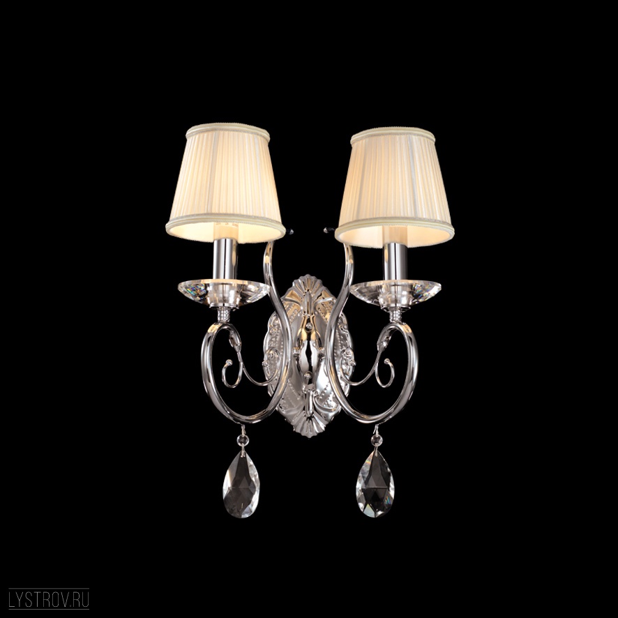металла цвета хром. Поверхность арматуры глянцевая. Плафон изготовлен из текстиля цвета слоновая кость, имеет конусную форму и матовую поверхность. Декоративные элементы выполнены из прозрачного хрусталя. Осветительный прибор рассчитан на освещение пространства площадью 4 кв. м. Тип цоколя используемых ламп E14. Производитель рекомендует использовать лампы мощностью не более 40 Вт. Суммарная мощность светильника составляет 80 Вт. Лампочки в комплект не входят. Защита от попадания влаги и пыли внутрь изделия не предусмотрена. Рекомендуем к применению в гостиной, кабинете, спальне.