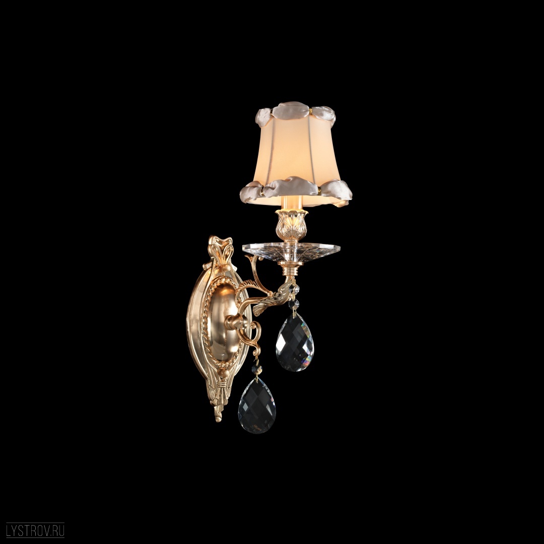 металла золотого цвета. Поверхность арматуры глянцевая и рельефная. Плафон изготовлен из текстиля цвета слоновая кость, имеет конусную форму и матовую поверхность. Направлен вверх. Декоративные элементы выполнены из прозрачного хрусталя. Осветительный прибор рассчитан на освещение пространства площадью 2 кв. м. Тип цоколя используемых ламп E14. Производитель рекомендует использовать лампы мощностью не более 40 Вт. Суммарная мощность светильника составляет 40 Вт. Лампочки в комплект не входят. Защита от попадания влаги и пыли внутрь изделия не предусмотрена. Рекомендуем к применению в гостиной, кабинете, спальне.