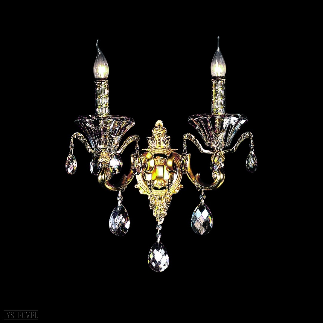 металла золотого цвета. Поверхность арматуры глянцевая и рельефная. Плафон отсутствует. Декоративные элементы выполнены из прозрачного хрусталя. Осветительный прибор рассчитан на освещение пространства площадью 6 кв. м. Тип цоколя используемых ламп E14. Производитель рекомендует использовать лампы мощностью не более 60 Вт. Суммарная мощность светильника составляет 120 Вт. Лампочки в комплект не входят. Защита от попадания влаги и пыли внутрь изделия не предусмотрена. Рекомендуем к применению в гостиной, кабинете, спальне.