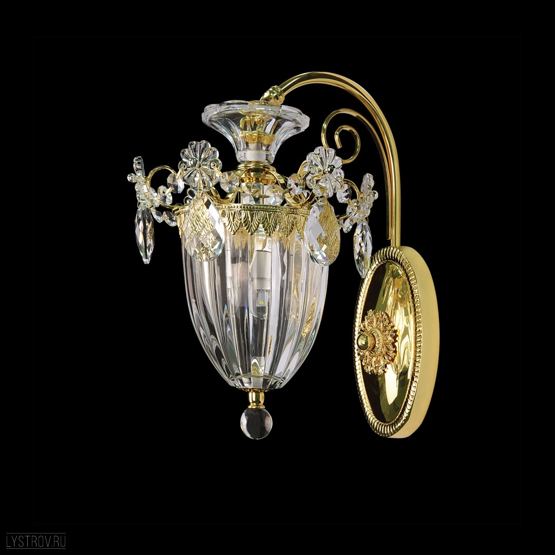 металла золотого цвета. Поверхность арматуры глянцевая. Плафон изготовлен из стекла прозрачного цвета, имеет форму колокола и прозрачную поверхность. Направлен вниз. Декоративные элементы выполнены из прозрачного хрусталя. Осветительный прибор рассчитан на освещение пространства площадью 3 кв. м. Тип цоколя используемых ламп E14. Производитель рекомендует использовать лампы мощностью не более 60 Вт. Суммарная мощность светильника составляет 60 Вт. Лампочки в комплект не входят. Защита от попадания влаги и пыли внутрь изделия не предусмотрена. Рекомендуем к применению в гостиной, кабинете, спальне.