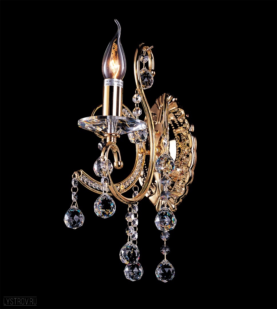 металла золотого цвета. Поверхность арматуры глянцевая. Плафон отсутствует. Декоративные элементы выполнены из прозрачного хрусталя. Осветительный прибор рассчитан на освещение пространства площадью 3 кв. м. Тип цоколя используемых ламп E14. Производитель рекомендует использовать лампы мощностью не более 60 Вт. Суммарная мощность светильника составляет 60 Вт. Лампочки в комплект не входят. Защита от попадания влаги и пыли внутрь изделия не предусмотрена. Рекомендуем к применению в гостиной, спальне, прихожей, коридоре.