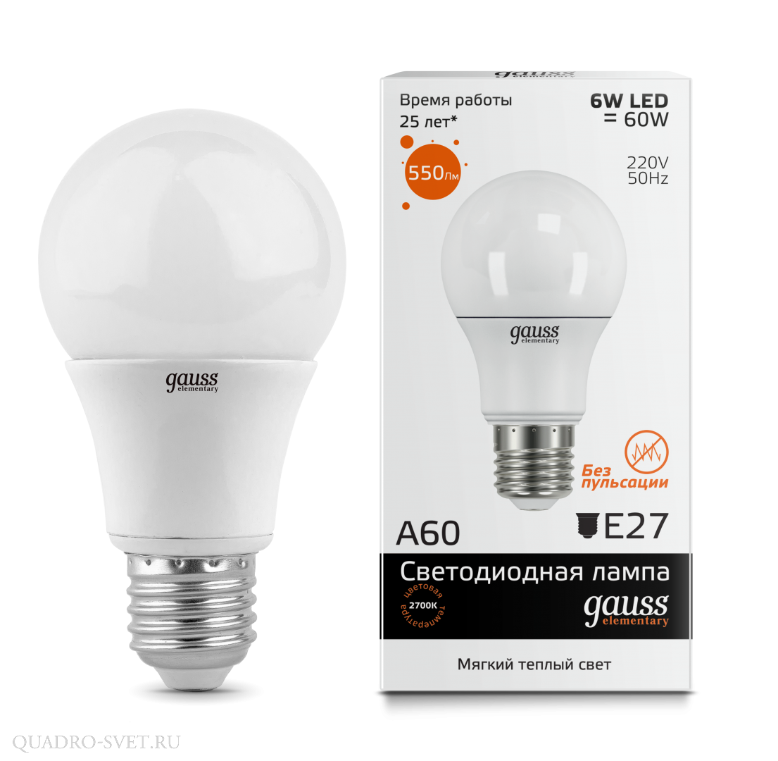 ЛОН 6Вт, 220В, тип цоколя E27, световой поток 550Лм, Цветовая температура 2700К