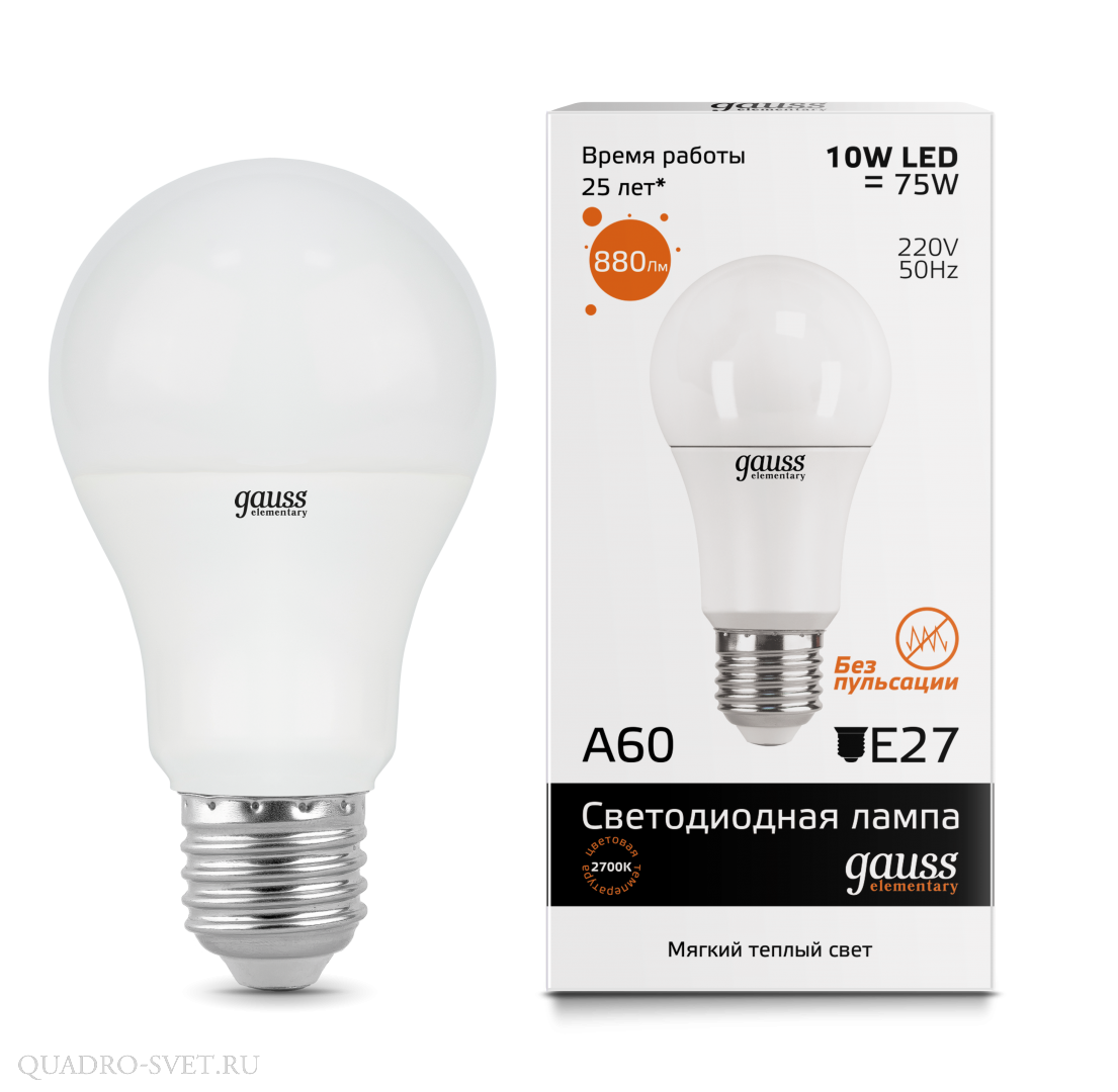 ЛОН 10Вт, 220В, тип цоколя E27, световой поток 880Лм, Цветовая температура 2700К