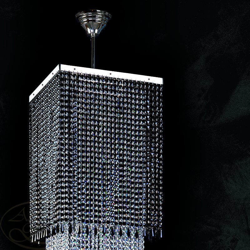 Большой хрустальный светильник размерами 0,4 х 0,4 x 1,5 м с 12 лампочками и хрустальными подвесками Crystal Exclusive или Swarovski Spectra. Хрустальные и стеклянные элементы вместе с мягко блестящими металлическими деталями гарантируют высокий блеск этого современного хрустального изделия. Люстра подходит к всем типам интерьеров - классическим и современным, и прекрасно комбинируется с другими типами хрустальных изделий - с люстрами или настенными светильниками.