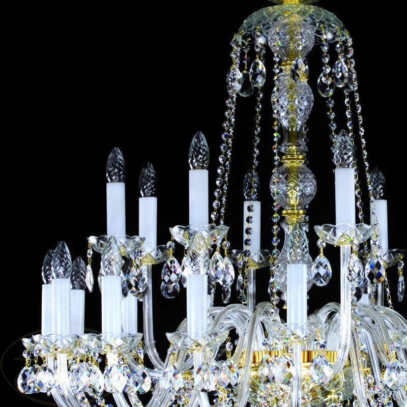 Большая хрустальная люстра размерами 95 х 130 см с 24 лампочками и хрустальными подвесками Classic, Crystal Exclusive или Swarovski Spectra. Хрустальные и стеклянные элементы вместе с мягко блестящими металлическими деталями гарантируют высокий блеск этого изделия. Светильник подходит к всем типам интерьеров - классическим и современным.