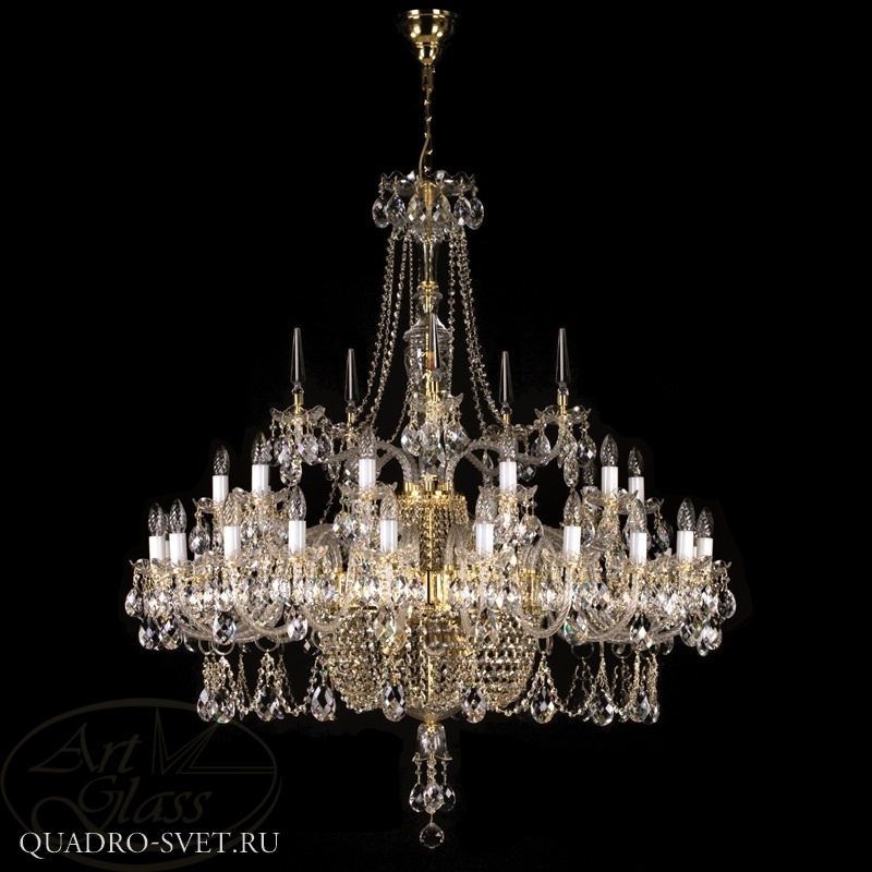 Большая хрустальная люстра размерами 1,22 х 1,30 см с 33 лампочками и хрустальными подвесками Classic, Crystal Exclusive или Swarovski Spectra. Хрустальные и стеклянные элементы вместе с мягко блестящими металлическими деталями гарантируют высокий блеск этого изделия. Светильник подходит к всем типам интерьеров - классическим и современным.