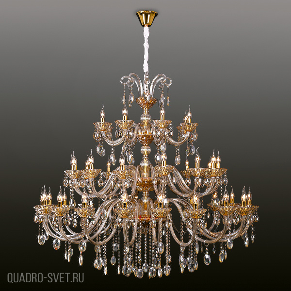 металла золотого цвета. Поверхность арматуры глянцевая. Плафон отсутствует. Декоративные элементы выполнены из хрусталя. Осветительный прибор рассчитан на освещение пространства площадью 201 кв. м. Тип цоколя используемых ламп E14. Производитель рекомендует использовать лампы мощностью не более 60 Вт. Суммарная мощность светильника составляет 2520 Вт. Лампочки в комплект не входят. Защита от попадания влаги и пыли внутрь изделия не предусмотрена. Рекомендуем к применению в гостиной, кабинете, спальне.
