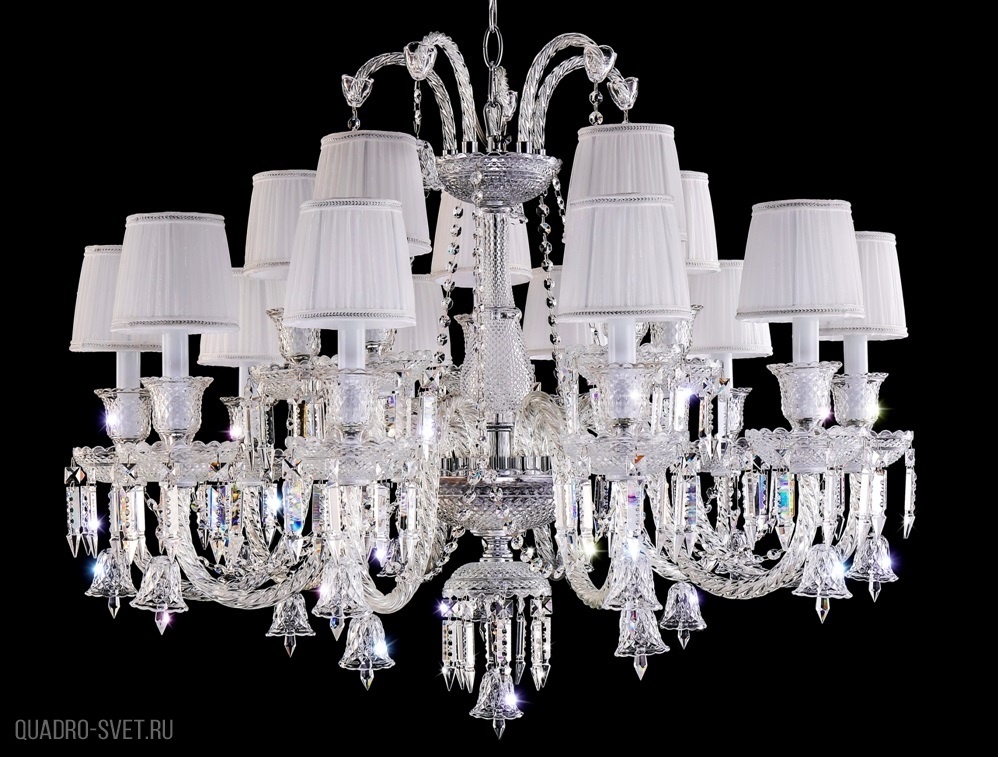 металла цвета хром. Поверхность арматуры глянцевая. Плафон изготовлен из текстиля белого цвета. Декоративные элементы выполнены из прозрачного хрусталя. Осветительный прибор рассчитан на освещение пространства площадью 45 кв. м. Тип цоколя используемых ламп E14. Производитель рекомендует использовать лампы мощностью не более 60 Вт. Суммарная мощность светильника составляет 900 Вт. Лампочки в комплект не входят. Защита от попадания влаги и пыли внутрь изделия не предусмотрена. Рекомендуем к применению в гостиной, спальне, прихожей, кабинете.