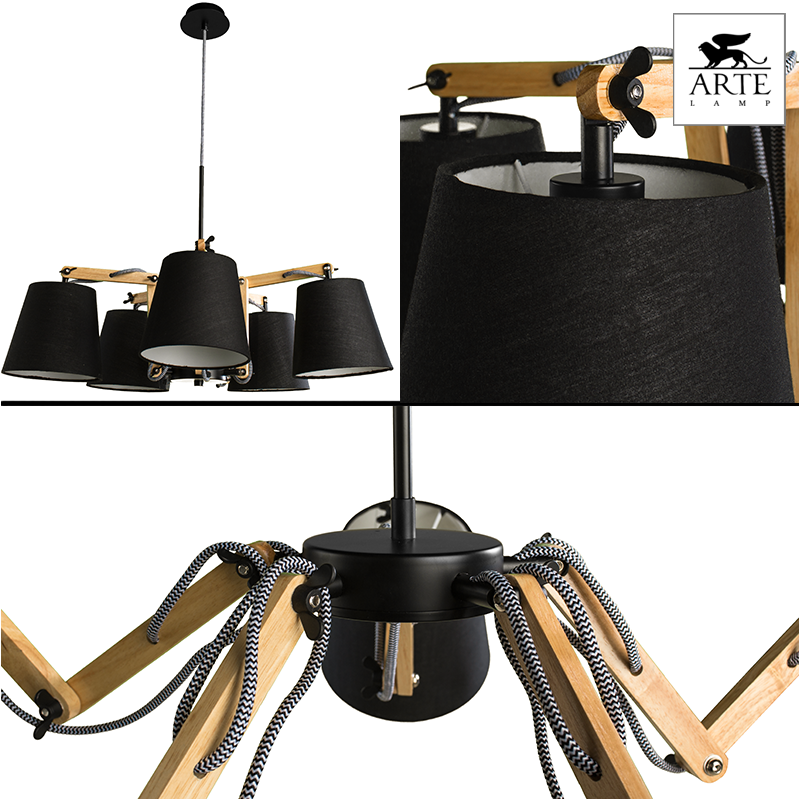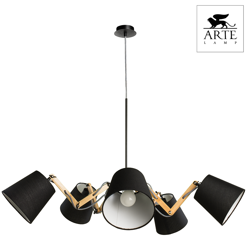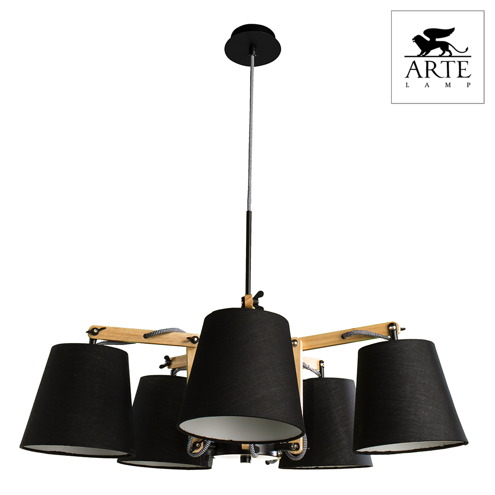 Подвесная люстра A5700LM-5BK итальянского производителя Arte Lamp из коллекции PINOCCIO выполнена в стиле модерн. Арматура светильника выполнена из металла и дерева черно-коричневого цвета. Поверхность арматуры глянцево-матовая. Плафон изготовлен из текстиля черного цвета, имеет конусную форму и матовую поверхность. Осветительный прибор рассчитан на освещение пространства площадью 10 кв. м. Тип цоколя используемых ламп E14. Производитель рекомендует использовать лампы мощностью не более 40 Вт. Суммарная мощность светильника составляет 200 Вт. Лампочки в комплект не входят. Защита от попадания влаги и пыли внутрь изделия не предусмотрена. Рекомендуем к применению в гостиной, кабинете, спальне.