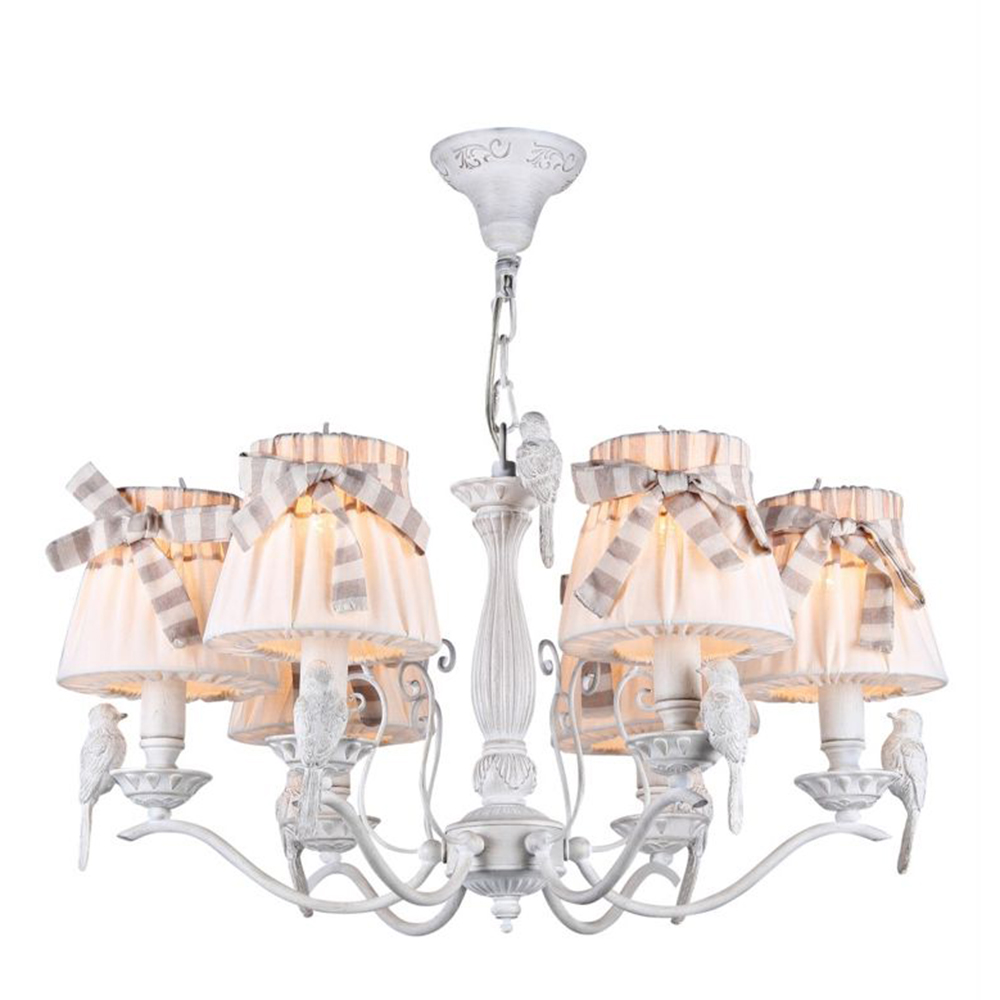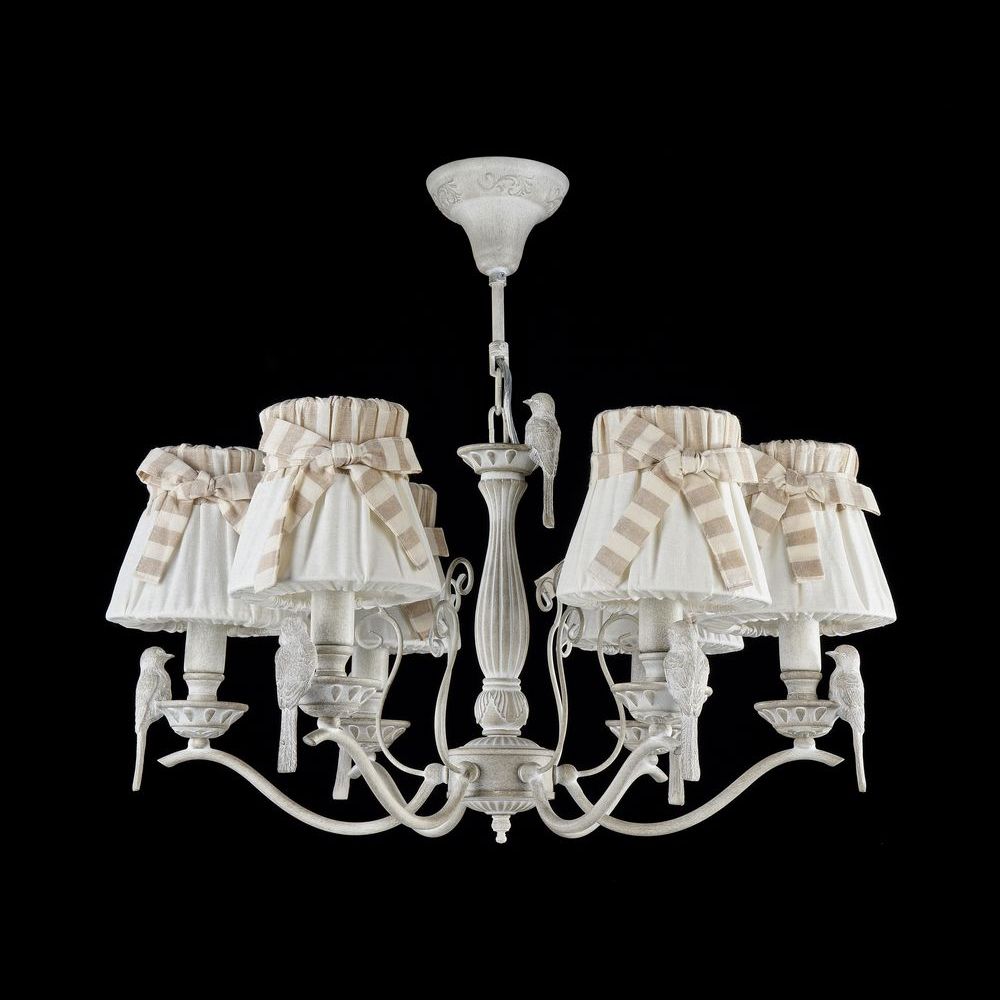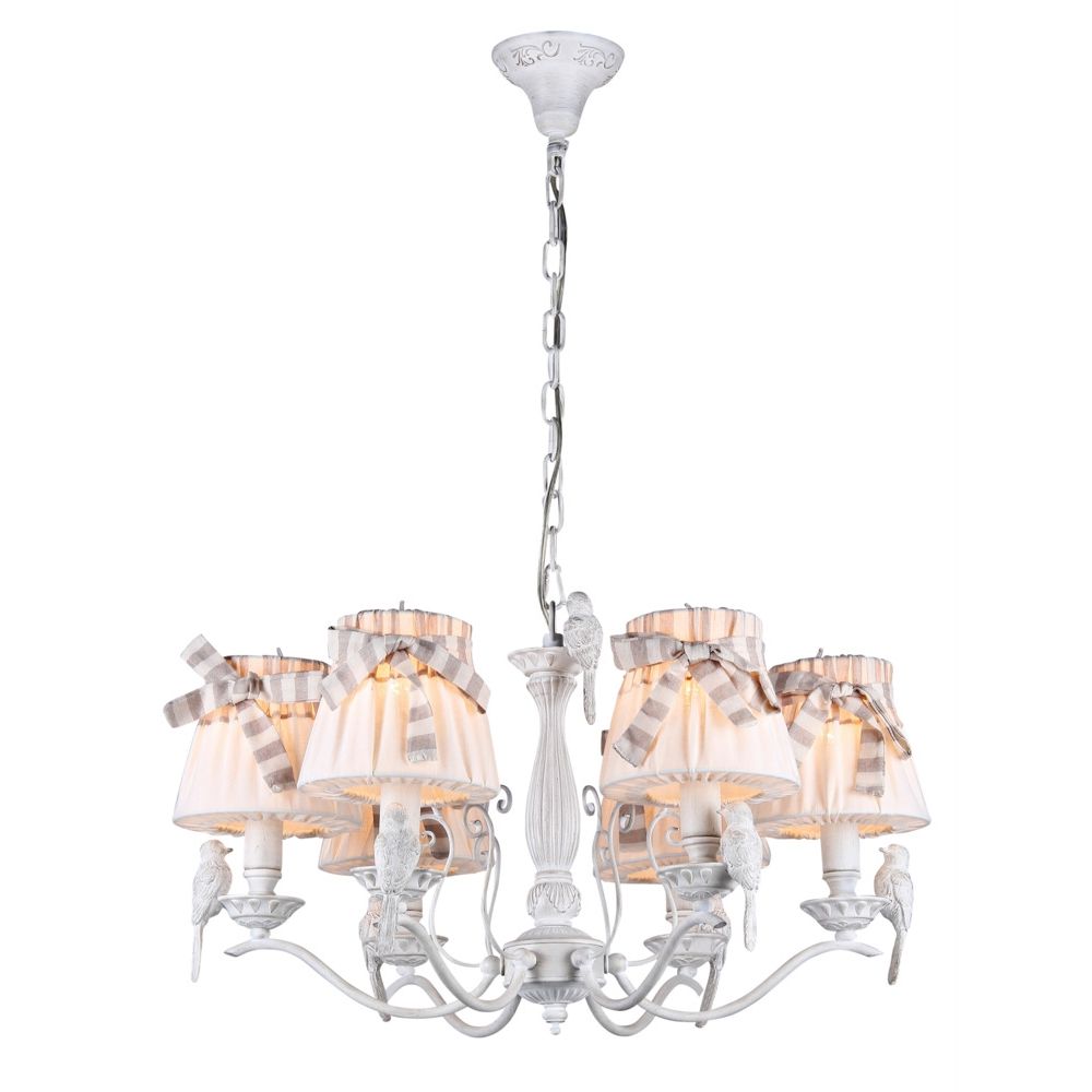 Подвесная люстра ARM013-06-W производства Maytoni (Германия) из коллекции Bird выполнена в стиле модерн. Арматура светильника выполнена из металла белого цвета. Поверхность арматуры матовая. Плафон изготовлен из текстиля белого цвета с полосатой лентой, имеет конусную форму и матовую поверхность. Направлен вверх. Осветительный прибор рассчитан на освещение пространства площадью 12 кв. м. Тип цоколя используемых ламп E14. Производитель рекомендует использовать лампы мощностью не более 40 Вт. Суммарная мощность светильника составляет 240 Вт. Лампочки в комплект не входят. Защита от попадания влаги и пыли внутрь изделия не предусмотрена. Рекомендуем к применению в гостиной, кабинете, спальне.