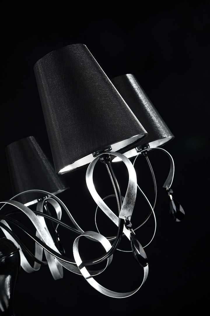 Подвесная люстра ARM010-06-R производства Maytoni (Германия) из коллекции Intreccio выполнена в стиле модерн. Арматура светильника выполнена из металла черного цвета. Поверхность арматуры матовая. Плафон изготовлен из текстиля черного цвета, имеет конусную форму и матовую поверхность. Направлен вверх и вниз. Декоративные элементы выполнены из хрусталя.Осветительный прибор рассчитан на освещение пространства площадью 12 кв. м. Тип цоколя используемых ламп E14. Производитель рекомендует использовать лампы мощностью не более 40 Вт. Суммарная мощность светильника составляет 240 Вт. Лампочки в комплект не входят. Защита от попадания влаги и пыли внутрь изделия не предусмотрена. Рекомендуем к применению в гостиной, кабинете, спальне.