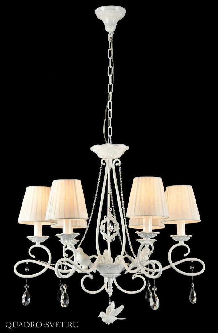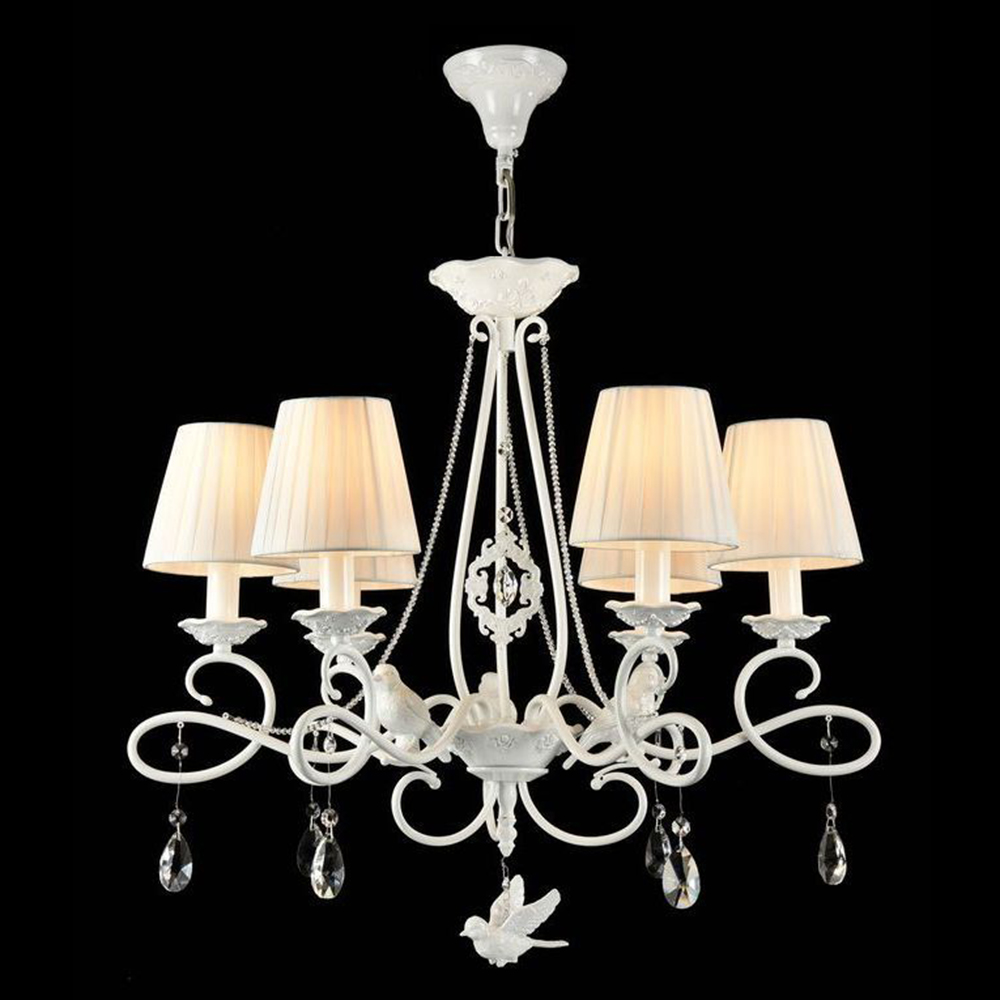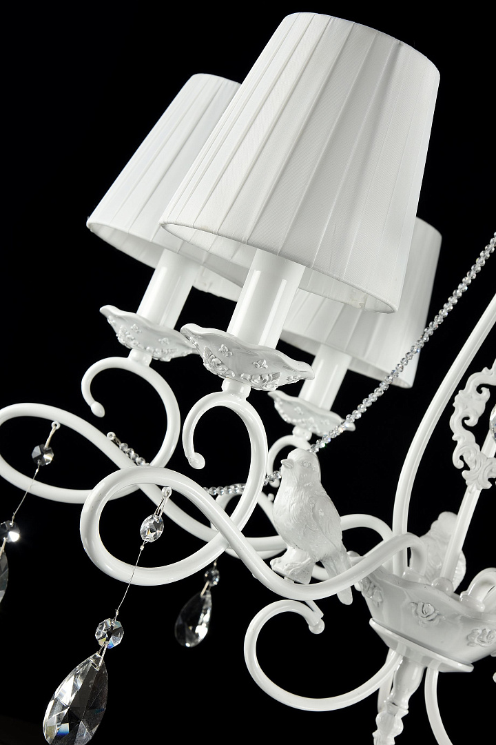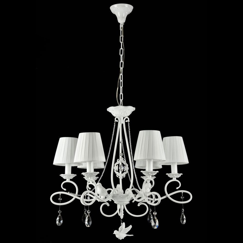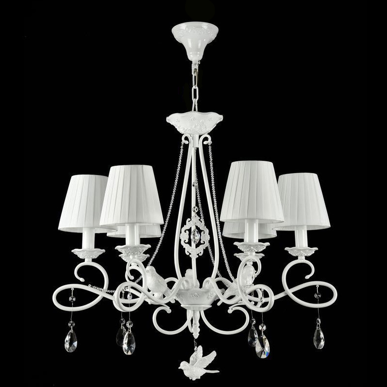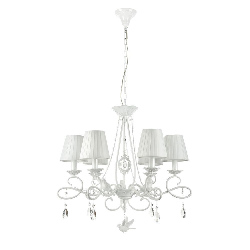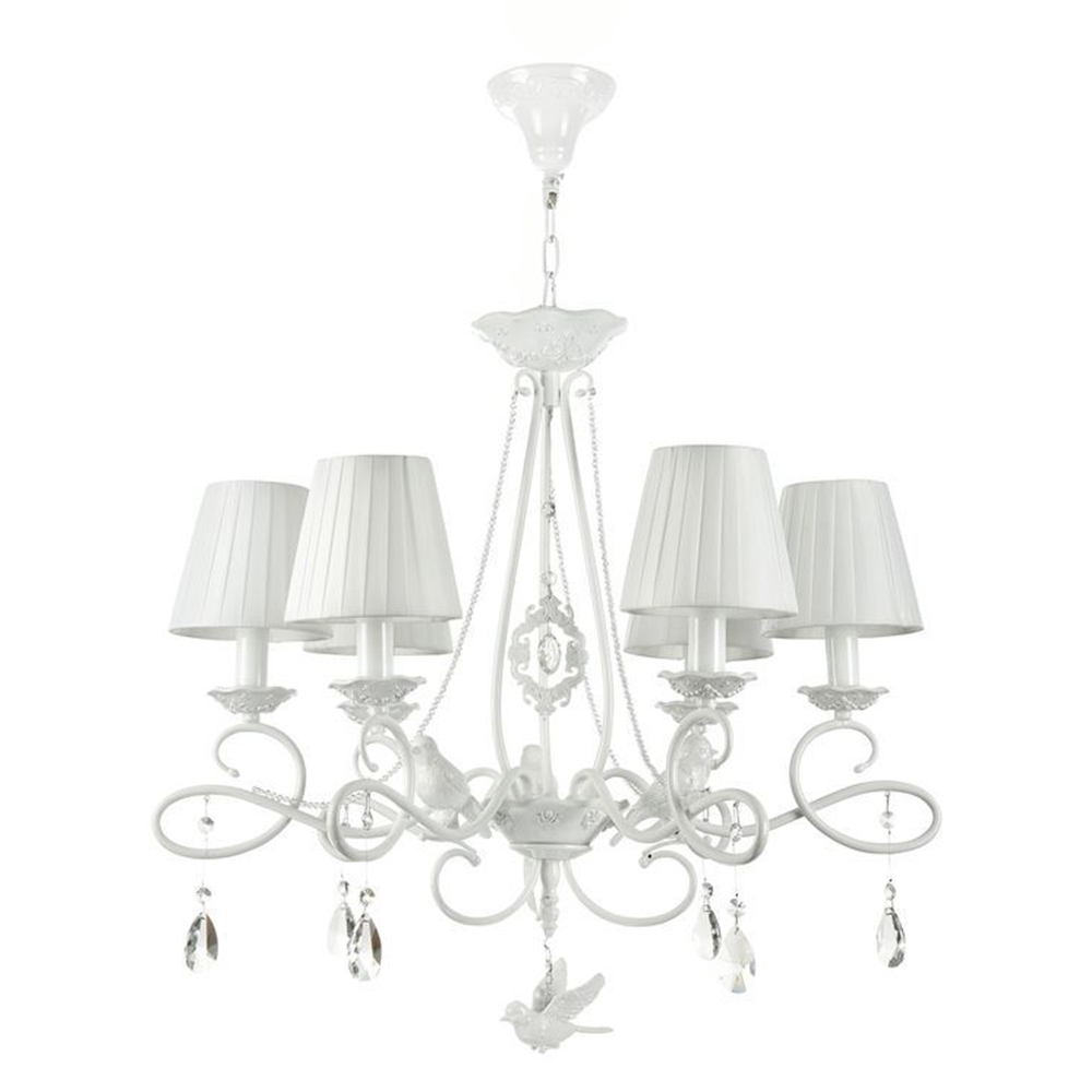 Подвесная люстра ARM001-06-W производства Maytoni (Германия) из коллекции Passarinho выполнена в стиле модерн. Арматура светильника выполнена из металла белого цвета. Поверхность арматуры матовая. Плафон изготовлен из текстиля белого цвета, имеет конусную форму и матовую поверхность. Направлен вверх и вниз. Декоративные элементы выполнены из хрусталя.Осветительный прибор рассчитан на освещение пространства площадью 12 кв. м. Тип цоколя используемых ламп E14. Производитель рекомендует использовать лампы мощностью не более 40 Вт. Суммарная мощность светильника составляет 240 Вт. Лампочки в комплект не входят. Защита от попадания влаги и пыли внутрь изделия не предусмотрена. Рекомендуем к применению в гостиной, кабинете, спальне.