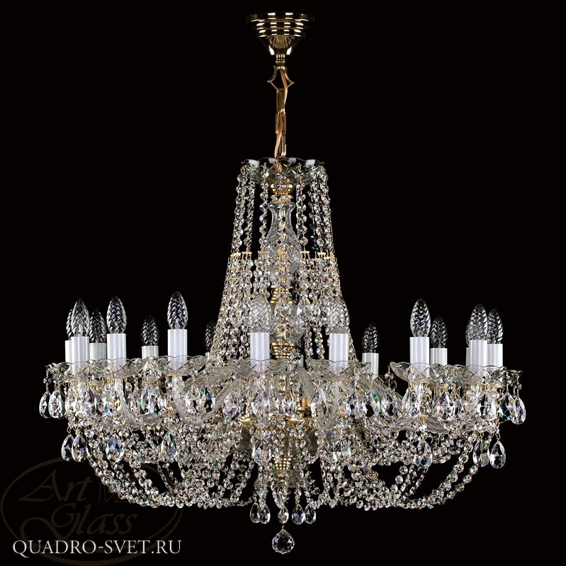 Хрустальная люстра размерами 85 х 75 см с 16 лампочками и хрустальными подвесками Classic, Crystal Exclusive или Swarovski Spectra. Хрустальные и стеклянные элементы вместе с мягко блестящими металлическими деталями гарантируют высокий блеск этого изделия. Светильник подходит к всем типам интерьеров - классическим и современным.