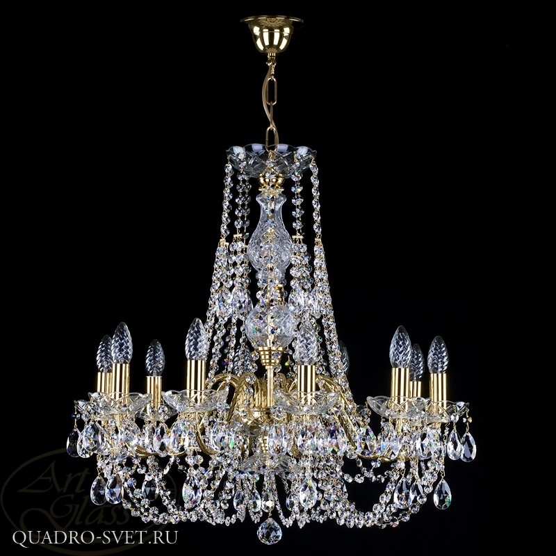 Xрустальная люстра размерами 65 x 64 см с металлическими рожками и 10 лампочками, с хрустальными подвесками Crystal Exclusive или Swarovski Spectra. Хрустальные и стеклянные элементы вместе с мягко блестящими металлическими деталями гарантируют высокий блеск этого изделия. Светильник подходит к всем типам интерьеров - классическим и современным, и прекрасно комбинируется с другими типами освещения - хрустальными бра или торшерами.
