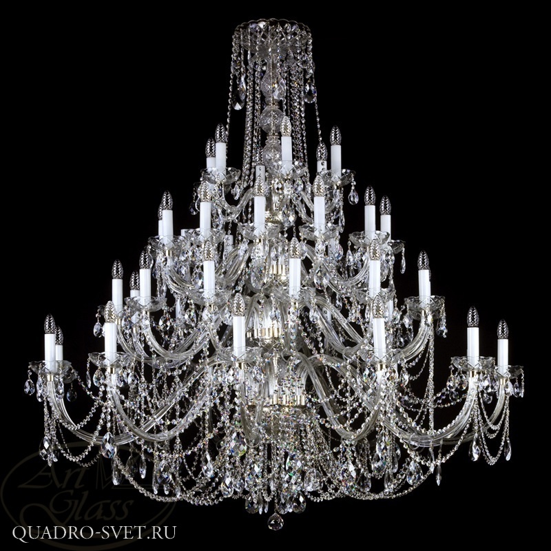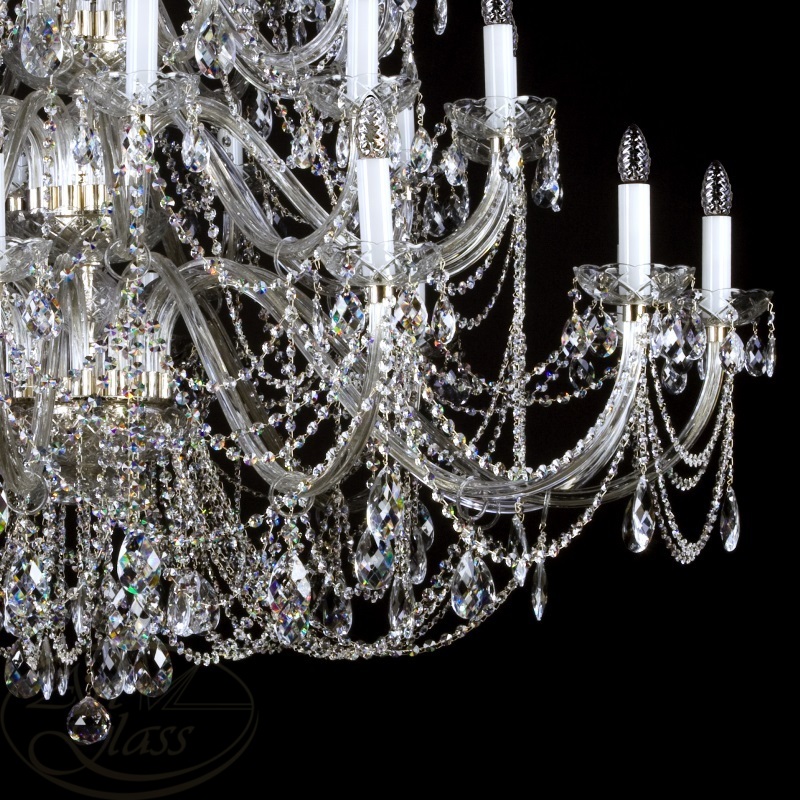 Большая хрустальная люстра размерами 1,5 х 1,5 м с 42 лампочками и хрустальными подвесками Classic, Crystal Exclusive или Swarovski Spectra. Хрустальные и стеклянные элементы вместе с мягко блестящими металлическими деталями гарантируют высокий блеск этого изделия. Светильник подходит к всем типам интерьеров - классическим и современным.