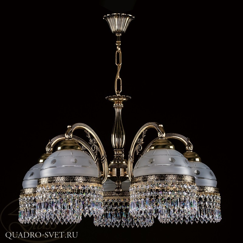 Латунная хрустальная люстра размерами 60 х 40 см, с 5 лампочками и с хрустальными подвесками Classic, Crystal Exclusive или Swarovski Spectra. Литые детали в золотом, сереврянном, старинном или других видах покрытия очень привлекательно комбинируются с блестящими хрустальными подвесками и гарантируют высокий блеск этого хрустального светильника. Люстра подходит к всем типам интерьеров - классическим или современным.