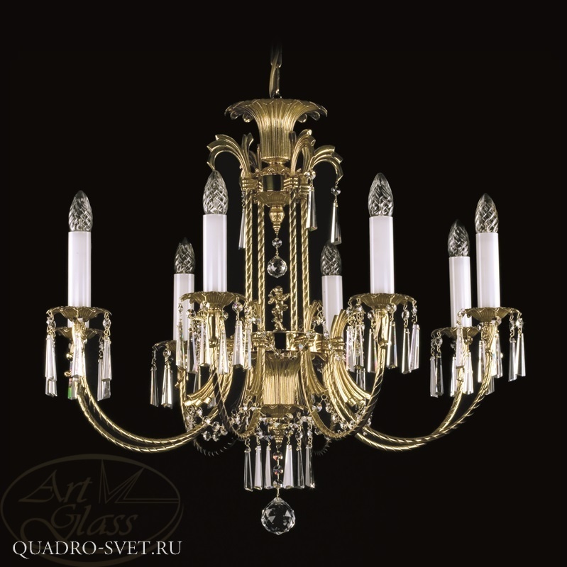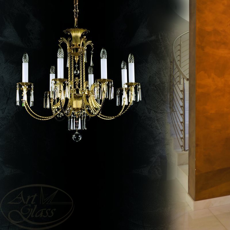 Xрустальная люстра размерами 74 x 64 см с металлическими рожками и 8 лампочками, с хрустальными подвесками Crystal Exclusive или Swarovski Spectra. Хрустальные и стеклянные элементы вместе с мягко блестящими металлическими деталями гарантируют высокий блеск этого изделия. Светильник подходит к всем типам интерьеров - классическим и современным, и прекрасно комбинируется с другими типами освещения - хрустальными бра или торшерами.