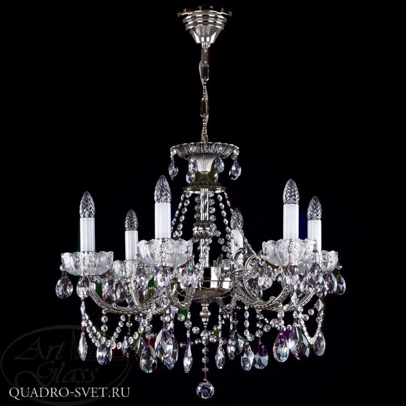 Латунная хрустальная люстра размерами 65 х 57 см, с 6 лампочками и с хрустальными подвесками Classic, Crystal Exclusive или Swarovski Spectra. Литые детали в золотом, сереврянном, старинном или других видах покрытия очень привлекательно комбинируются с блестящими хрустальными подвесками и гарантируют высокий блеск этого хрустального светильника. Люстра подходит к всем типам интерьеров - классическим или современным.