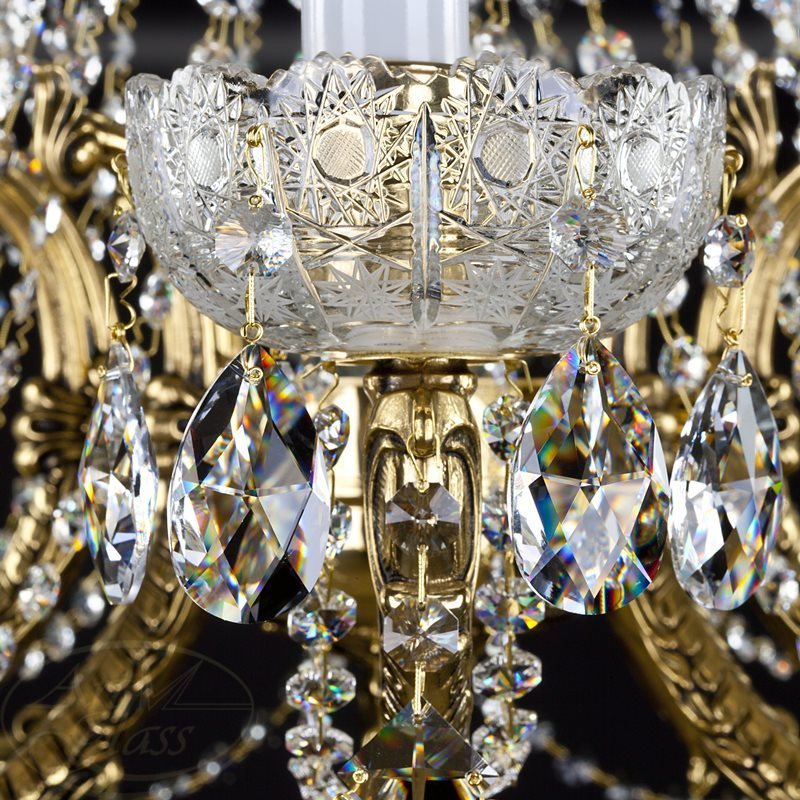 Латунная хрустальная люстра размерами 82 х 65 см, с 10 лампочками и с хрустальными подвесками Classic, Crystal Exclusive или Swarovski Spectra. Литые детали в золотом, сереврянном, старинном или других видах покрытия очень привлекательно комбинируются с блестящими хрустальными подвесками и гарантируют высокий блеск этого хрустального светильника. Люстра подходит к всем типам интерьеров - классическим или современным.