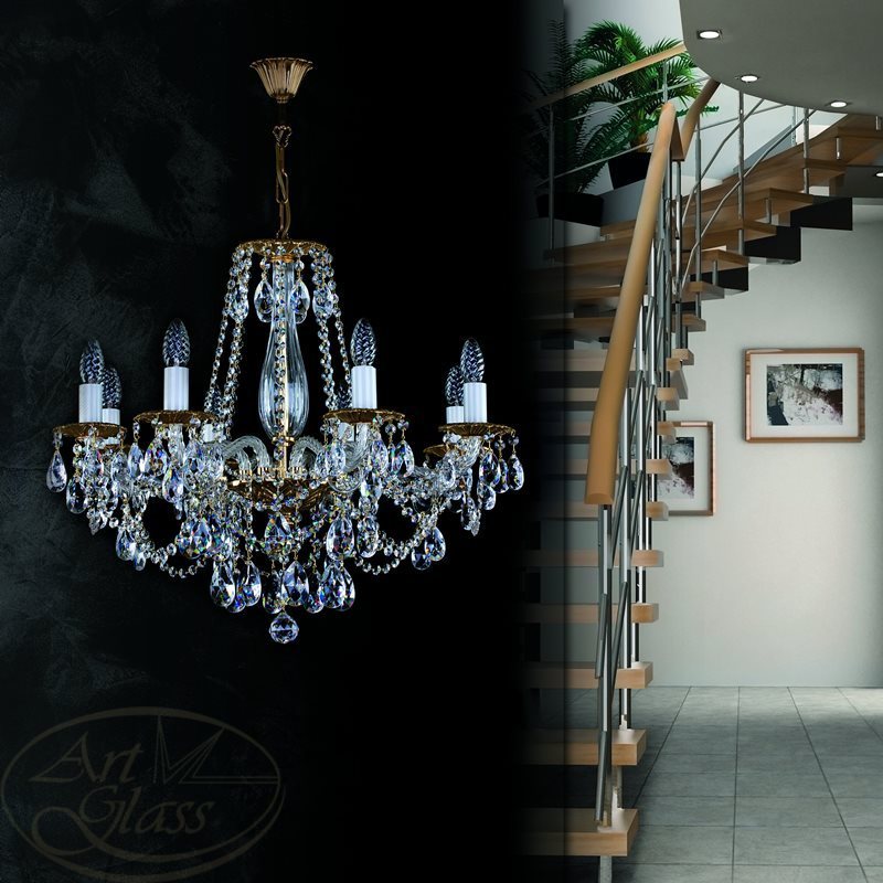 Хрустальная люстра размерами 68 х 58 см с 8 лампочками и хрустальными подвесками Classic, Crystal Exclusive или Swarovski Spectra. Хрустальные и стеклянные элементы вместе с мягко блестящими металлическими деталями гарантируют высокий блеск этого изделия. Светильник подходит к всем типам интерьеров - классическим и современным.