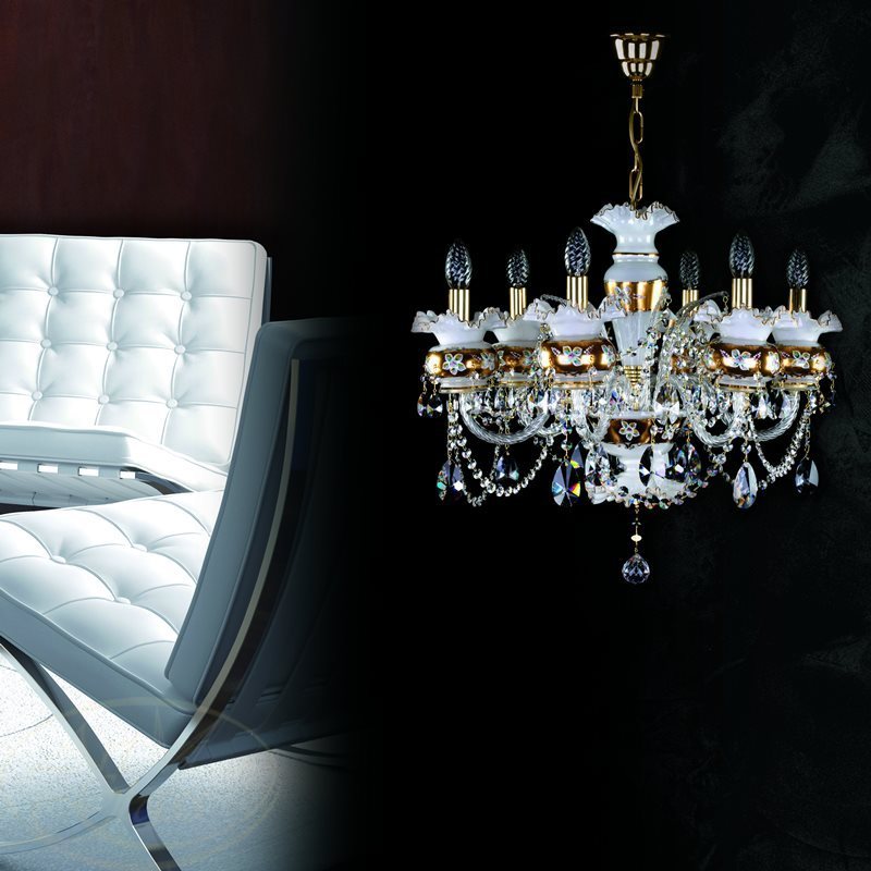 Хрустальная люстра размерами 66 х 50 см с 6 лампочками и хрустальными подвесками Classic, Crystal Exclusive или Swarovski Spectra. Хрустальные и стеклянные элементы вместе с мягко блестящими металлическими деталями гарантируют высокий блеск этого изделия. Светильник подходит к всем типам интерьеров - классическим и современным.