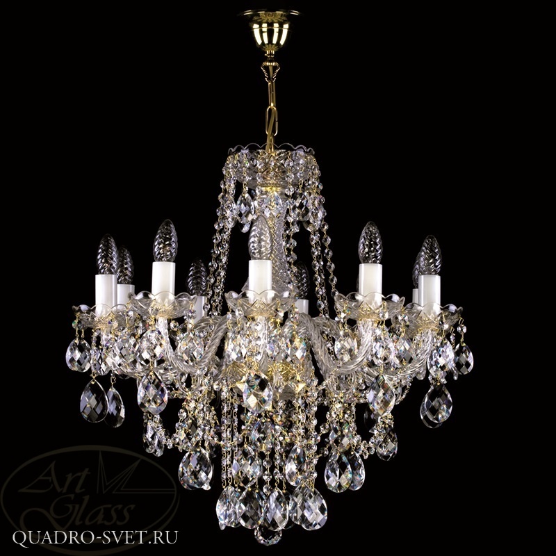 Хрустальная люстра размерами 59 х 57 см с 10 лампочками и хрустальными подвесками Classic, Crystal Exclusive или Swarovski Spectra. Хрустальные и стеклянные элементы вместе с мягко блестящими металлическими деталями гарантируют высокий блеск этого изделия. Светильник подходит к всем типам интерьеров - классическим и современным.