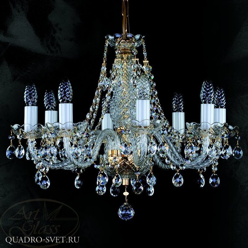 Хрустальная люстра размерами 56 х 42 см с 8 лампочками и хрустальными подвесками Classic, Crystal Exclusive или Swarovski Spectra. Хрустальные и стеклянные элементы вместе с мягко блестящими металлическими деталями гарантируют высокий блеск этого изделия. Светильник подходит к всем типам интерьеров - классическим и современным.