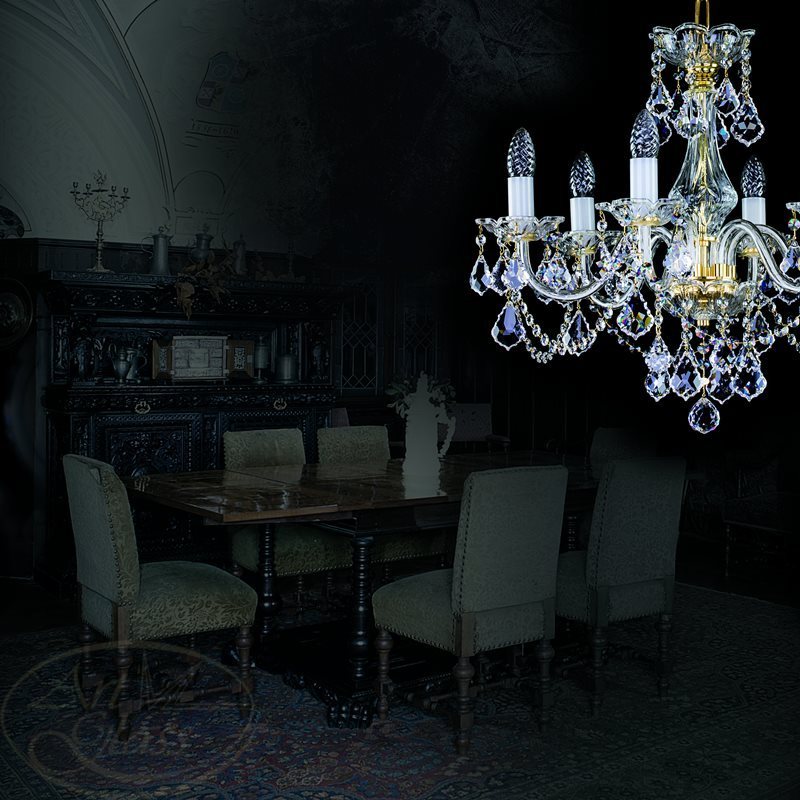 Хрустальная люстра размерами 56 х 49 см с 6 лампочками и хрустальными подвесками Crystal Exclusive или Swarovski Spectra. Хрустальные и стеклянные элементы вместе с мягко блестящими металлическими деталями гарантируют высокий блеск этого изделия. Светильник подходит к всем типам интерьеров - классическим и современным.