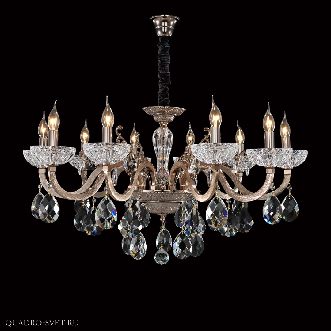 металла бронзового цвета. Поверхность арматуры глянцевая и рельефная. Плафон отсутствует. Декоративные элементы выполнены из хрусталя. Осветительный прибор рассчитан на освещение пространства площадью 20 кв. м. Тип цоколя используемых ламп E14. Производитель рекомендует использовать лампы мощностью не более 40 Вт. Суммарная мощность светильника составляет 400 Вт. Лампочки в комплект не входят. Защита от попадания влаги и пыли внутрь изделия не предусмотрена. Рекомендуем к применению в гостиной, кабинете, спальне.