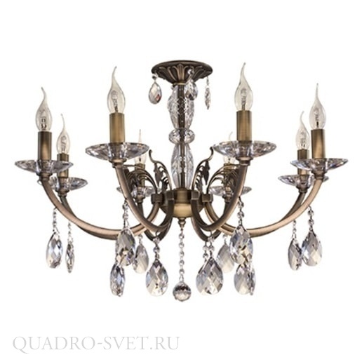 металла бронзового цвета. Поверхность арматуры матовая. Плафон отсутствует. Лампы направленывверх и вниз. Декоративные элементы выполнены из хрусталя. Осветительный прибор рассчитан на освещение пространства площадью 24 кв. м. Тип цоколя используемых ламп E14. Производитель рекомендует использовать лампы мощностью не более 60 Вт. Суммарная мощность светильника составляет 480 Вт. Лампочки в комплект не входят. Защита от попадания влаги и пыли внутрь изделия не предусмотрена. Рекомендуем к применению в гостиной, кабинете, спальне.