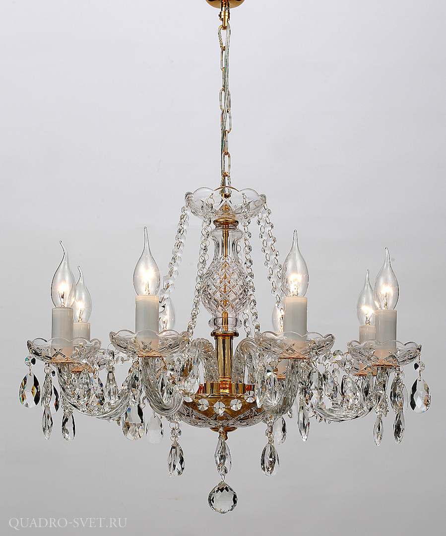 Хрустальная подвесная люстра 1735-8P производства Favourite (Германия) из коллекции Monreal выполнена в стиле классика. Арматура светильника выполнена из металла золотого цвета. Поверхность арматуры глянцевая. Плафон отсутствует. Декоративные элементы выполнены из хрусталя.Осветительный прибор рассчитан на освещение пространства площадью 16 кв. м. Тип цоколя используемых ламп E14. Производитель рекомендует использовать лампы мощностью не более 40 Вт. Суммарная мощность светильника составляет 320 Вт. Лампочки в комплект не входят. Защита от попадания влаги и пыли внутрь изделия не предусмотрена. Рекомендуем к применению в гостиной, кабинете, спальне.